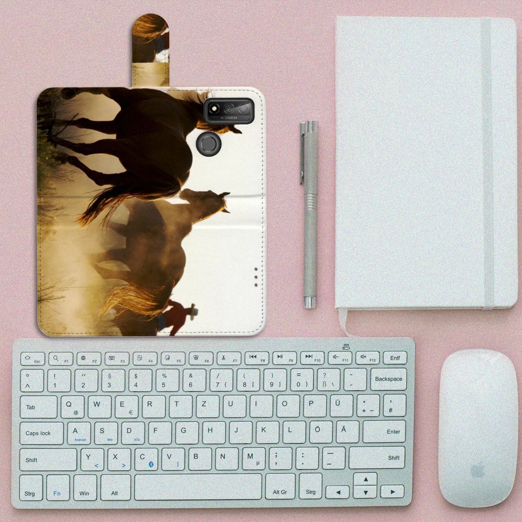 Voor de paardenliefhebbers onder ons hebben we onze collectie uitgebreid met dit design hoesje met print van een cowboy met paarden. Vroeger hield de mens vooral werkpaarden, inmiddels hebben we vriendschap gesloten met het paard. Vandaar dat het ook een favoriet dier is op onze smartphonehoesjes, zoals deze boekhoesjes. Dit Telefoonhoesje met Pasjes met paarden is niet alleen super mooi en chique, het sluit ook nog perfect dankzij het lipje aan de buitenzijde. Verder heeft de case een TPU houder aan de binnenzijde en houders voor pasjes en briefgeld. Zie je liever je eigen paard terug op een hoesje voor jouw Huawei P Smart 2020? Dat kan! Door zelf een uniek hoesje te ontwerpen, met eigen foto’s en teksten. Het boekhoesje met paarden wordt aan alle zijden bedrukt.
