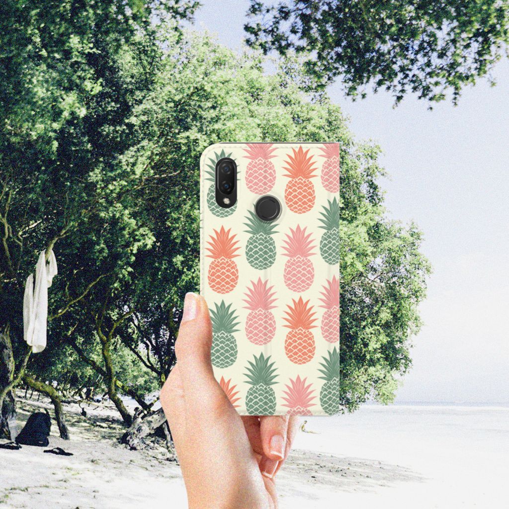 Ananas is een woord uit het Tupi, de taal van de Tupi-indianen, en betekent uitmuntende vrucht. Dit fruit van zeer hoge kwaliteit staat op onze superieure boekhoesjes, stand cases, hard cases en TPU cases. Jij blijft er gezond uitzien als je zo nu en dan een hap neemt van een Ananas , jouw smartphone blijft tip top in orde als je er een leuk telefoonhoesje omheen doet. Een ananas heeft stevig, veerkrachtig vruchtvlees. Een beetje te vergelijken met het TPU in onze hoesjes. TPU is elastisch materiaal, dat zeer buigzaam is. Vandaar dat het zeer schokbestendig is. Het ananas design staat op een stand case. Deze Huawei P Smart Plus Flip Style Cover beschermt jouw telefoon aan alle kanten en beschikt over een 1 opbergvakje en een speciale standaard. Het hoesje wordt afgesloten met een magneet aan de binnenzijde. De houder aan de binnenzijde is van TPU.