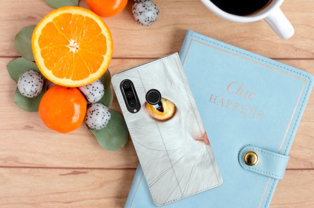 Witte katten zijn natuurlijk extra speciaal, vandaar we een exemplaar op een design hoesje hebben gezet. Een witte kat schijnt trouwens ook slechter te kunnen horen dan katten met een andere kleur. Deze witte kat staat op een zeer prominente wijze op een stand case. Deze stand case met witte kat ziet er geweldig uit en is voorzien van verschillende uitsparingen en een speciale standaard. Een Huawei P30 Lite New Edition Hoesje maken met witte kat beschermt jouw smartphone perfect. Alle zijden van de case zijn bedrukt. Jouw smartphone wordt erg duurzaam met dit design hoesje. Het TPU aan de binnenzijde is zeer flexibel en het pu-leer oogt chique. Verder heeft de case een houder voor bijvoorbeeld je rijbewijs aan de binnenkant.