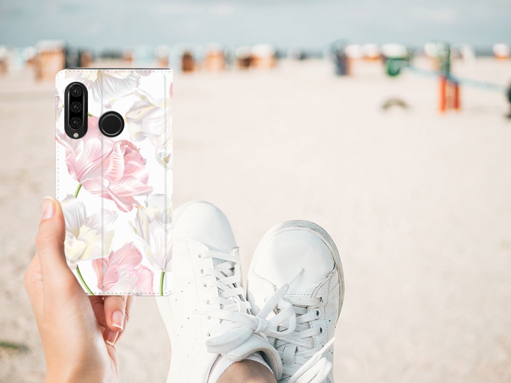 Een bosje bloemen doet een mens (en zijn smartphone) goed. De witte en roze bloemen op dit Huawei P30 Lite New Edition Smart Cover geven jouw smartphone een zeer mooie uitstraling. Je wordt er ook meteen een stuk rustiger van als je aan het appen of aan het bellen bent. Valt dan je telefoon op de grond, dan zal er dankzij de stand case met het design Lovely Flowers ontstaan. Onze stand cases met roze en witte bloemen zien er zeer prettig uit en zijn heel praktisch, wat blijkt uit onder meer het vakje aan de binnenkant en de handige standaard waarmee je de smartphone rechtop op tafel neer kunt zetten. De roze en witte bloemen passen goed op alle zijden van de case. Op deze stand case van leer en TPU (houder aan de binnenkant) kun je trouwens ook je eigen bloemige ontwerp zetten. In een paar simpele stappen maak je zelf een stand hoesje met daarop jouw mooiste bloemen.