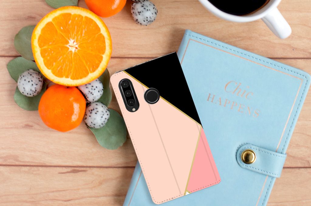 Huawei P30 Lite New Edition Print Stand Case Zwart Roze Vormen
