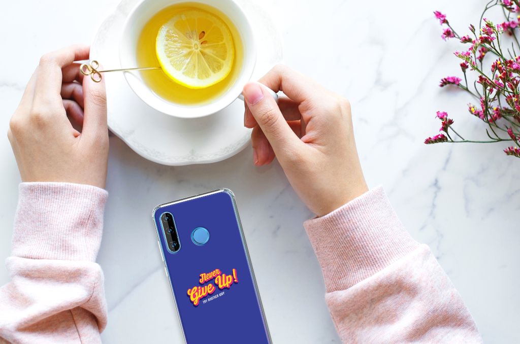 Ben je op zoek naar een uniek telefoonhoesje voor je Huawei P30 Lite? Dan ben je bij B2C Telecom aan het juiste adres! Speciaal voor jou hebben we dit prachtige Never Give Up design in onze collectie hoesjes opgenomen. Het design wordt bedrukt op een Telefoonhoesje met tekst en is gemaakt van flexibel rubber. Het hoesje is perfect voor de actieve smartphonegebruiker door de opstaande randen/hoeken. Denk aan mensen die veel sporten, reizen of wandelen en net iets meer zekerheid willen als het op hun geliefde telefoon aankomt. Het design wordt alleen aan de bovenkant van het hoesje bedrukt en de randen blijven transparant. Aan de zijkanten zijn uitsparingen gemaakt waardoor je met gemak alle knoppen en poorten kunt bedienen. Wij adviseren om dit hoesje in combinatie met een screenprotector te gebruiken voor een langere levensduur van je telefoon. Wil je dit hoesje nog iets extra's geven? Voeg dan gratis je naam of een quote toe! Is dit design hoesje toch niet helemaal wat je zocht? Ontwerp dan zelf een hoesje in ons ontwerpprogramma.