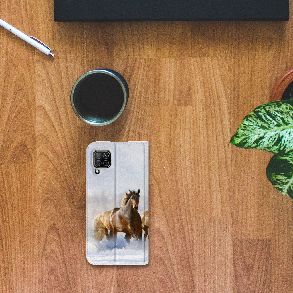 Voor de paardenliefhebbers onder ons hebben we onze collectie uitgebreid met dit design hoesje met print van paarden. Vroeger hield de mens vooral werkpaarden, inmiddels hebben we vriendschap gesloten met het paard. Vandaar dat het ook een favoriet dier is op onze smartphonehoesjes, zoals deze stand cases. Deze Huawei P40 Lite Hoesje maken met Paarden is niet alleen super mooi en chique, het sluit ook nog perfect dankzij de magneet aan de binnenzijde. Verder heeft de case een TPU houder aan de binnenzijde en een houder voor een pasje. Zie je liever je eigen paard terug op een hoesje? Dat kan! Door zelf een uniek hoesje te ontwerpen, met eigen foto’s en teksten. De stand case met paarden wordt aan alle zijden bedrukt.