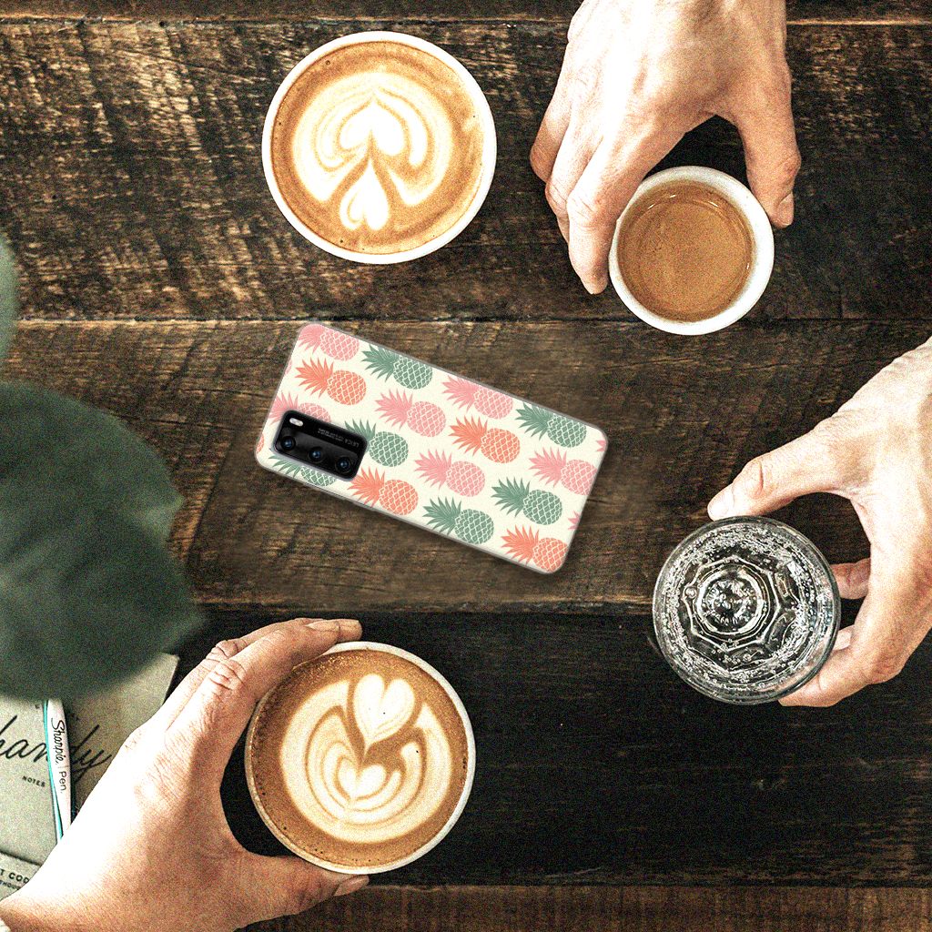 Ananas is een woord uit het Tupi, de taal van de Tupi-indianen, en betekent uitmuntende vrucht. Dit fruit van zeer hoge kwaliteit staat op onze superieure boekhoesjes, stand cases, hard cases en TPU cases. Jij blijft er gezond uitzien als je zo nu en dan een hap neemt van een Ananas , jouw smartphone blijft tip top in orde als je er een leuk telefoonhoesje omheen doet. Een ananas heeft stevig, veerkrachtig vruchtvlees. Een beetje te vergelijken met het TPU in onze hoesjes. TPU is elastisch materiaal, dat zeer buigzaam is. Vandaar dat het zeer schokbestendig is. Het ananas design staat op een staat op een TPU case. Deze Huawei P40 Siliconen Case wordt alleen aan de bovenkant bedrukt en is zeer flexibel. De randen van het hoesje blijven transparant.