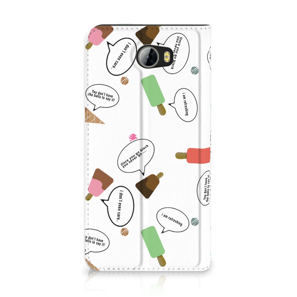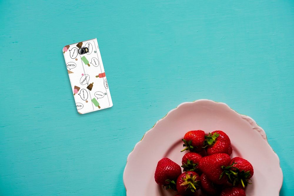 Van deze vrolijke Huawei Y5 2 | Y6 Compact Flip Style Cover met daarop verschillende soorten ijsjes met tekstwolkjes krijg je sowieso een vrij en zomers gevoel. De zomer komt naar je toe met deze print van ijsjes met tekstwolkjes. Ben je op het strand, dan ontbreekt een lekker ijsje natuurlijk niet. Net zoals je je smartphone bij de hand hebt, met daaromheen een design hoesje met bijzondere ijsjes en tekstwolkjes. Jouw telefoon kan dan de bescherming in de vorm van een stand case met ijsjes zeer goed gebruiken. Alle zijden van dit hoesje worden bedrukt met ijsjes en dankzij de speciale standaard is het erg prettig om filmpjes te bekijken. De case wordt aan de binnenzijde met een magneet afgesloten en de houder aan de binnenzijde is van TPU. Onder alle weersomstandigheden zal deze case met 1 opbergvakje en ijsjes perfect functioneren, ook op het strand met een ijsje in je hand.