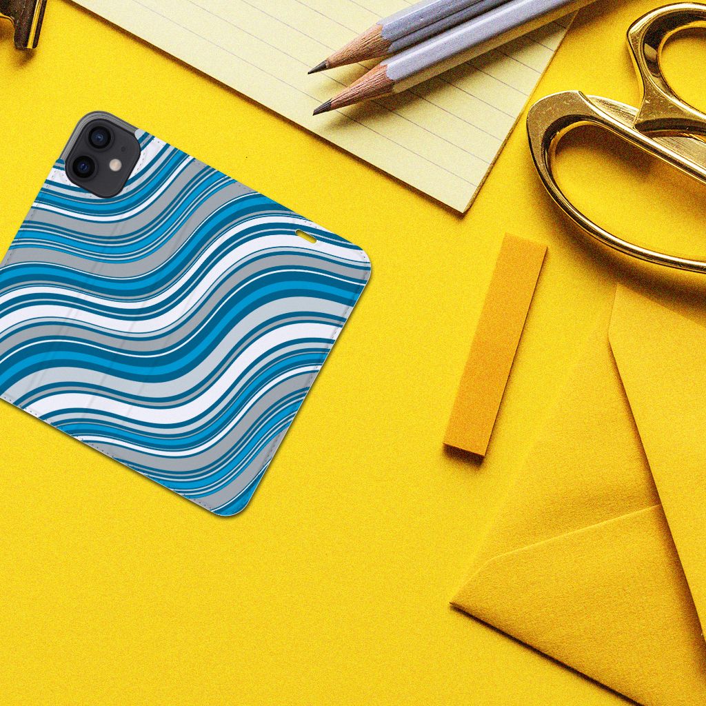 Zeer cool, dit hoesje met vooral blauwe kleuren, die in een golvende beweging jouw telefoon van een mooie uitstraling voorzien. Tijdens een zonnige vakantie aan zee is jouw smartphone perfect beschermd met dit telefoonhoesje. Het design Waves Blue van dit smartphone hoesje doet lichtjes denken aan een lolly, waarmee je een klein kind zeer blij maakt. Jouw iPhone 12 Mini zal er ook zeer vrolijk uitzien samen met dit design hoesje. De witte en grijze kleuren staan in mooi contrast met het blauw, waardoor de uitstraling van deze accessoire zeer mooi is. Ook voor andere kleuren kun je natuurlijk uitstekend terecht in ons assortiment. Het design staat op een Hoesje met Magneet. Deze case beschermt jouw telefoon aan alle kanten en beschikt over een 1 opbergvakje en een speciale standaard. Het hoesje wordt afgesloten met een magneet aan de binnenzijde. De houder aan de binnenzijde is van TPU.