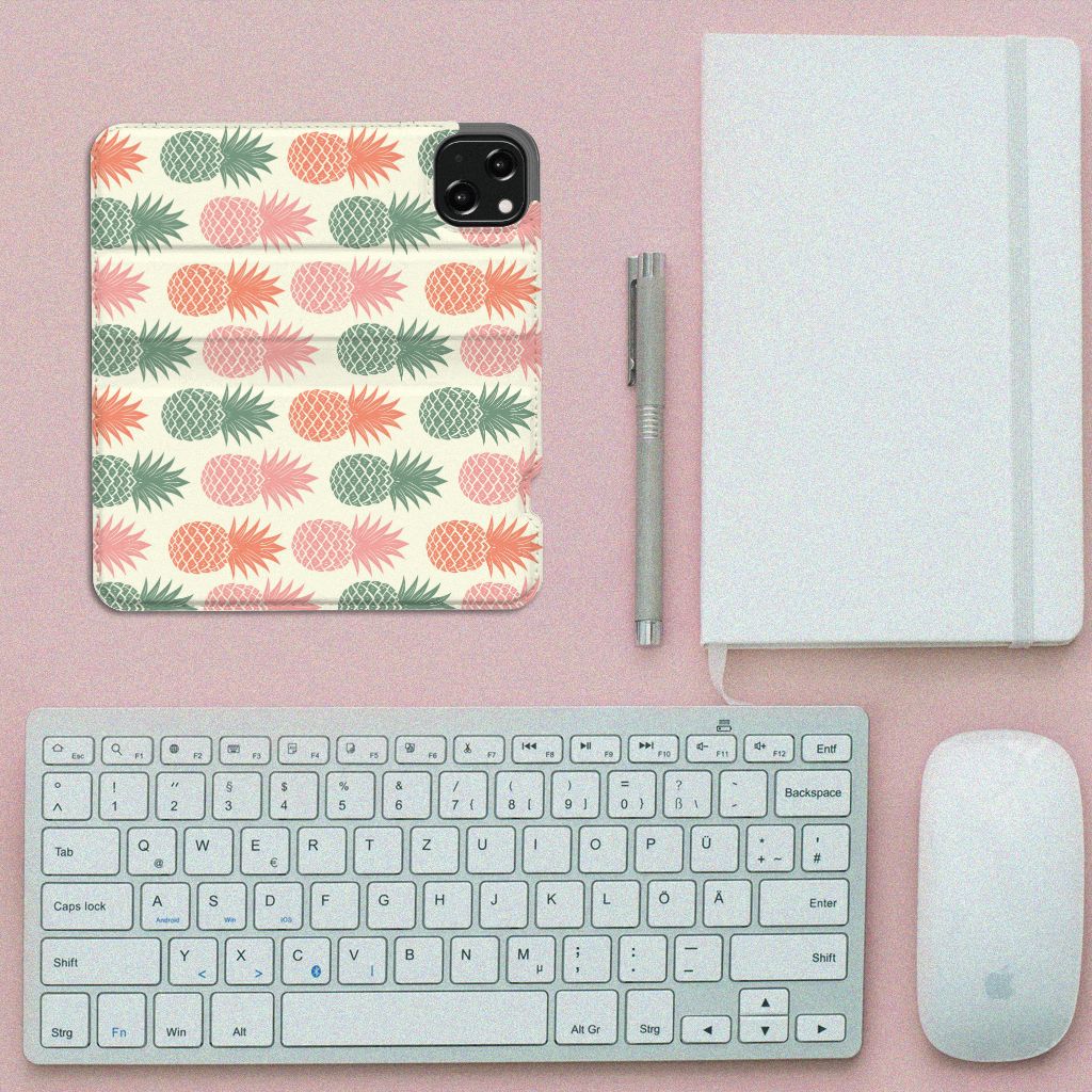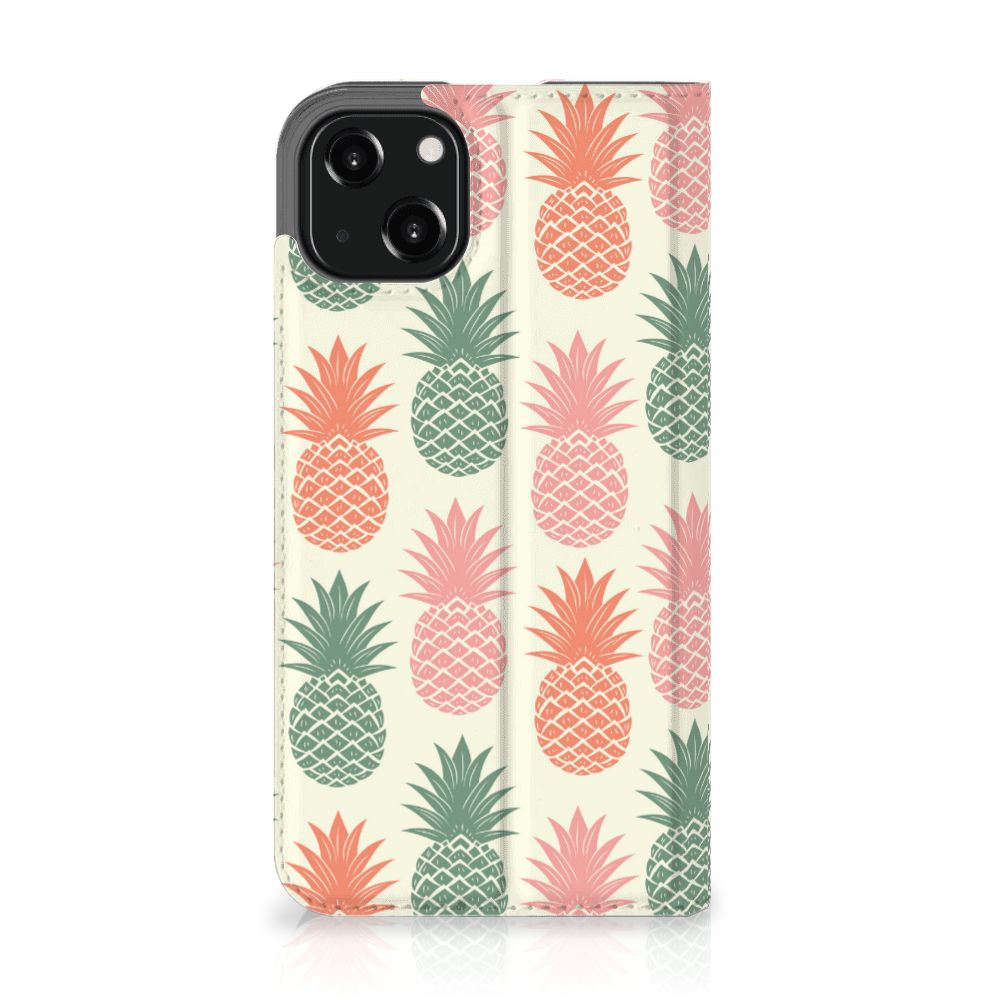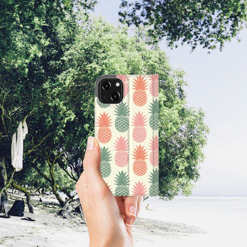 Ananas is een woord uit het Tupi, de taal van de Tupi-indianen, en betekent uitmuntende vrucht. Dit fruit van zeer hoge kwaliteit staat op onze superieure boekhoesjes, stand cases, hard cases en TPU cases. Jij blijft er gezond uitzien als je zo nu en dan een hap neemt van een Ananas , jouw smartphone blijft tip top in orde als je er een leuk telefoonhoesje omheen doet. Een ananas heeft stevig, veerkrachtig vruchtvlees. Een beetje te vergelijken met het TPU in onze hoesjes. TPU is elastisch materiaal, dat zeer buigzaam is. Vandaar dat het zeer schokbestendig is. Het ananas design staat op een stand case. Deze iPhone 13 Flip Style Cover beschermt jouw telefoon aan alle kanten en beschikt over een 1 opbergvakje en een speciale standaard. Het hoesje wordt afgesloten met een magneet aan de binnenzijde. De houder aan de binnenzijde is van TPU.