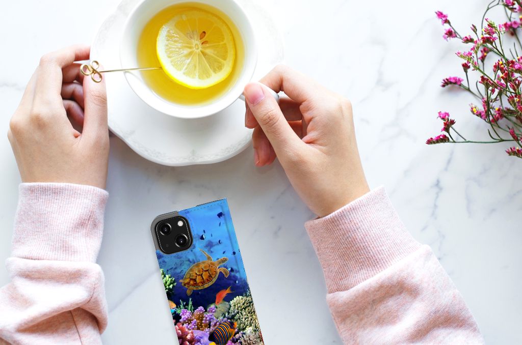 Dit kleurrijke hoesje met tropische Vissen is een ware eyecatcher. Als je aan het duiken bent en je treft een school aan met dit soort opvallende vissen, dan heb je een geweldige ervaring. Maar je hoeft er eigenlijk niet per se het water voor in te duiken. Want wij hebben een schitterende verzameling vissen op dit design hoesje gezet. Met onze zeer geavanceerde printer zetten we de afbeelding van vissen op alle zijden van de iPhone 13 Mini Hoesje maken. De case heeft aan de binnenkant een vakje waarin je jouw creditcard of ander pasje kwijt kunt. Ga je een dagje vissen, dan hoef je de portemonnee dus ook niet op zak te hebben. Verder is je telefoon natuurlijk maximaal beschermd met deze stand case met print van tropische vissen. De houder aan de binnenzijde van het design hoesje met vissen print is van TPU.