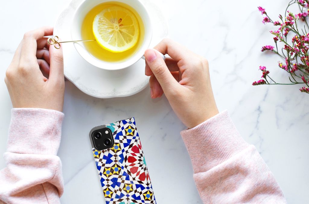 Aan design hoesjes met kunstvormen geen gebrek in onze uitgebreide collectie. Wat dacht je van dit design hoesje met Mozaïek . Dit is een kunstvorm waarbij een grote afbeelding wordt gemaakt uit een groot aantal kleine gekleurde steentjes (tesserae), die in een vloer of wand worden gemetseld. Deze gekleurde steentjes zie je terug op deze stand case met design van mozaïek. Een stand case is een van de veiligste cases die er bestaan. Een iPhone 13 Mini Standcase met print zorgt voor een volledige bescherming van je smartphone en wordt aan alle zijden bedrukt met mozaïek. Verder is de houder aan de binnenzijde van TPU. De Grieken en Romeinen beheersten de kunst al. Op diverse plaatsen in Europa zijn mozaïeken teruggevonden die tot op de dag van vandaag goed bewaard zijn gebleven. Met een hoesje met mozaïek blijft jouw telefoon in tact. Je pasje en kun je in het vakje aan de binnenzijde stoppen. De case heeft ook een standaard.