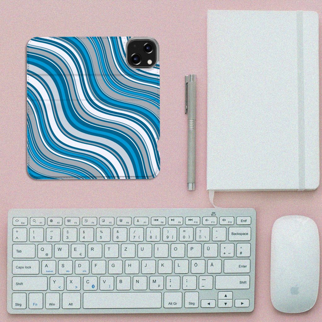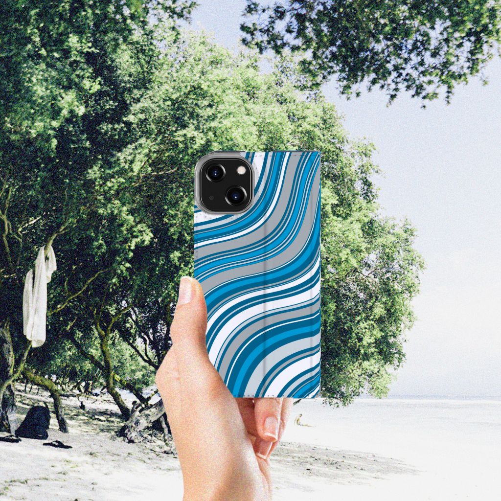 Zeer cool, dit hoesje met vooral blauwe kleuren, die in een golvende beweging jouw telefoon van een mooie uitstraling voorzien. Tijdens een zonnige vakantie aan zee is jouw smartphone perfect beschermd met dit telefoonhoesje. Het design Waves Blue van dit smartphone hoesje doet lichtjes denken aan een lolly, waarmee je een klein kind zeer blij maakt. Jouw iPhone 14 zal er ook zeer vrolijk uitzien samen met dit design hoesje. De witte en grijze kleuren staan in mooi contrast met het blauw, waardoor de uitstraling van deze accessoire zeer mooi is. Ook voor andere kleuren kun je natuurlijk uitstekend terecht in ons assortiment. Het design staat op een Hoesje met Magneet. Deze case beschermt jouw telefoon aan alle kanten en beschikt over een 1 opbergvakje en een speciale standaard. Het hoesje wordt afgesloten met een magneet aan de binnenzijde. De houder aan de binnenzijde is van TPU.