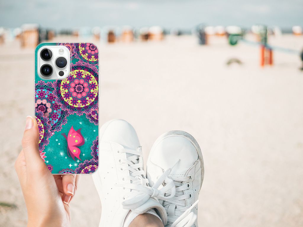 Deze opvallende iPhone 14 Pro Max Hoesje maken met Cirkels en Vlinders is een ware eyecatcher. De meeste vlinders hebben een onopvallende vleugelkleur en dat kun je van de soort op dit hoesje ook zeker wel zeggen. Wij kunnen deze opvallende vlinders en cirkels op een zeer handige tpu case zetten. Deze hoesjes zijn gewild omwille hun flexibiliteit. Met onze geavanceerde printer zetten we de print van opvallende vlinders en cirkels op de achterkant van het hoesje. De case met vlinders en cirkels blijft aan de zijkanten doorzichtig, zodat je maximaal het design van je smartphone behoudt. Verder is je telefoon natuurlijk goed beschermd met deze tpu case met print van blauwe vlinders. De bovenkant wordt bedrukt, de zijkanten niet. Met een screenprotector bescherm je ook het scherm maximaal.
