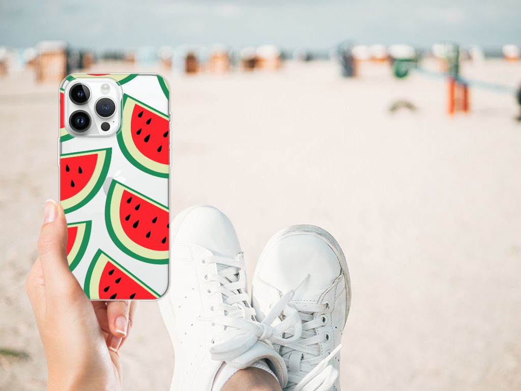 Watermeloenen zijn uitstekende dorstlessers, misschien dat je daarom juist in de zomermaanden extra enthousiast raakt van dit design hoesje Watermelons. Jij blijft gezond als je zo nu en dan een watermeloen neemt, jouw smartphone blijft in tact als je er deze iPhone 14 Pro Max Siliconen Case omheen doet. Deze tpu case wordt alleen aan de bovenkant bedrukt met watermeloenen is zeer flexibel. De randen van het hoesje blijven transparant. Je kunt ook kiezen voor andere soorten fruit op je hoesje. Kijk maar eens naar onze andere design hoesjes op onze website.