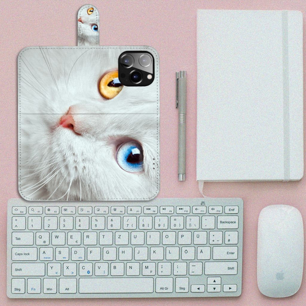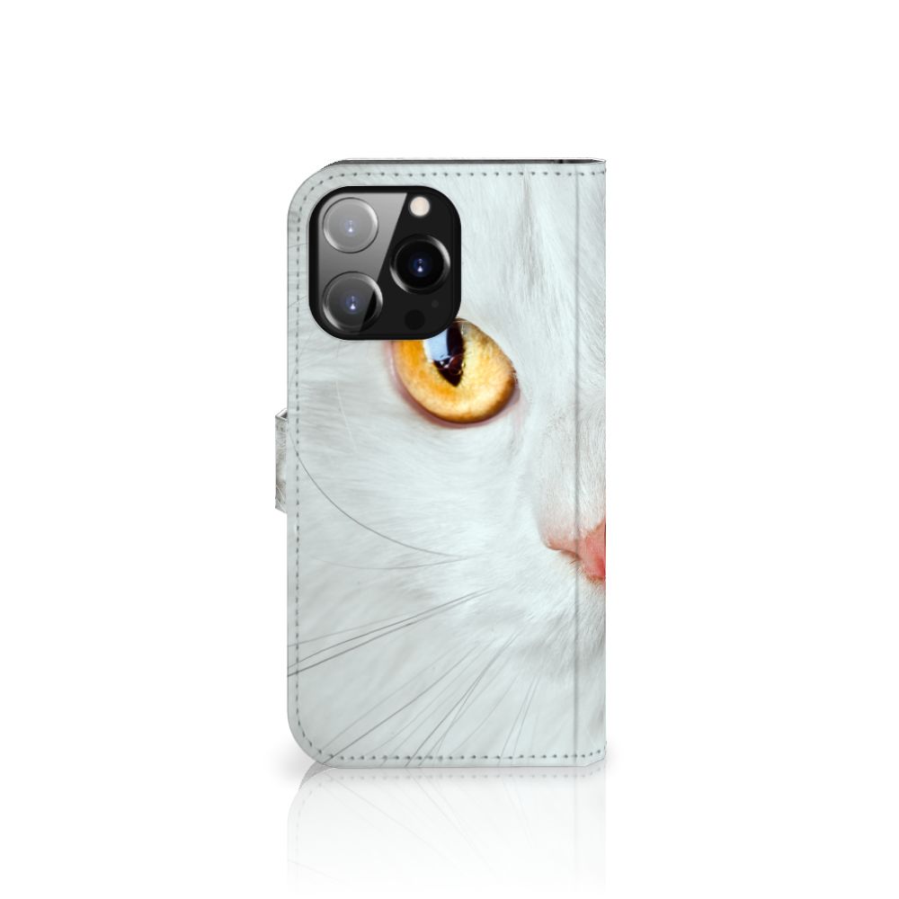iPhone 14 Pro Max Telefoonhoesje met magnetisch lipje als sluiting Witte Kat