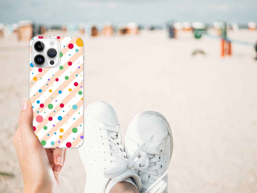 Een iPhone 14 Pro Max TPU bumper met verschillende kleuren stippen is een schitterende bescherming van jouw smartphone. De tpu case met het design Dots in alle kleuren van de regenboog komt voor jou als geroepen. Maak je geen gebruik van dit zeer mooie hoesje, dan kan het met jouw smartphone een beetje beroerd aflopen. Deze mooie tpu case met verschillende soorten klompen in verschillende kleuren is zo’n beetje de meest flexibele case die er bestaat. Het hoesje met stippen zorgt voor een goede bescherming van je smartphone, vooral aan de achterzijde en zijkanten. Met een tpu hoesje met stippen in verschillende kleuren blijft jouw gsm volledig in tact. Heb je liever een tpu case met stippen in andere opvallende kleuren? Ontwerp dan zelf een tpu case met je eigen foto’s en teksten! De case wordt aan de achterzijde bedrukt met klompen, de zijkanten blijven doorzichtig.