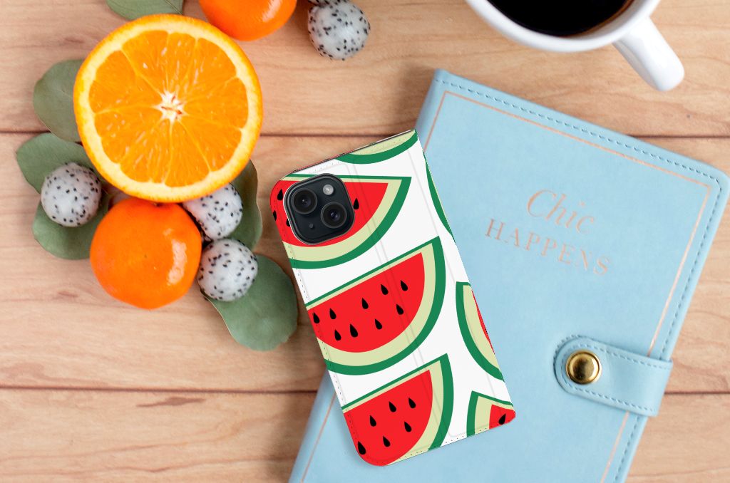 Watermeloenen zijn uitstekende dorstlessers, misschien dat je daarom juist in de zomermaanden extra enthousiast raakt van dit design hoesje Watermelons. Jij blijft gezond als je zo nu en dan een watermeloen neemt, jouw smartphone blijft in tact als je er deze iPhone 15 Flip Style Cover omheen doet. De stand case beschermt jouw telefoon aan alle kanten en beschikt over een 1 opbergvakje en een speciale standaard. Het hoesje wordt afgesloten met een magneet aan de binnenzijde. De houder aan de binnenzijde is van TPU. Je kunt ook kiezen voor andere soorten fruit op je hoesje. Kijk maar eens naar onze andere design hoesjes op onze website.