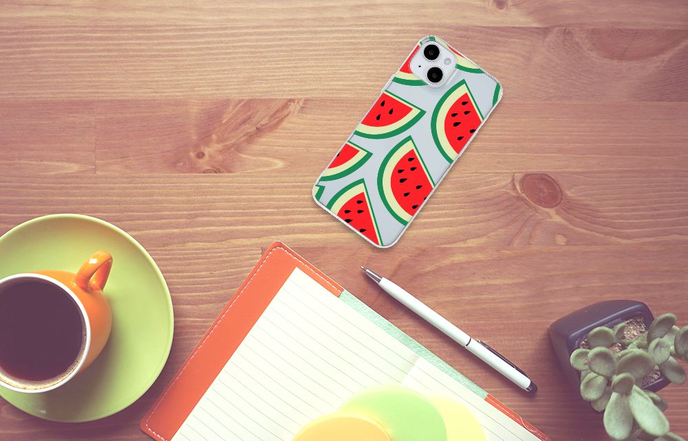 Watermeloenen zijn uitstekende dorstlessers, misschien dat je daarom juist in de zomermaanden extra enthousiast raakt van dit design hoesje Watermelons. Jij blijft gezond als je zo nu en dan een watermeloen neemt, jouw smartphone blijft in tact als je er deze iPhone 15 Plus Siliconen Case omheen doet. Deze tpu case wordt alleen aan de bovenkant bedrukt met watermeloenen is zeer flexibel. De randen van het hoesje blijven transparant. Je kunt ook kiezen voor andere soorten fruit op je hoesje. Kijk maar eens naar onze andere design hoesjes op onze website.