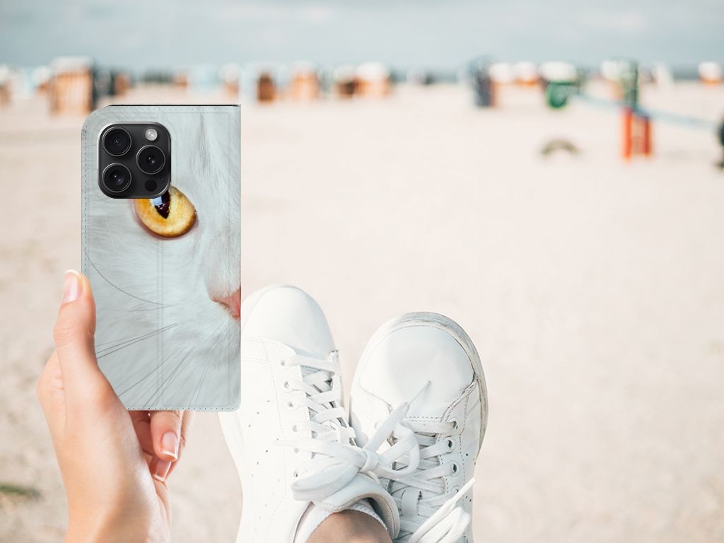 Witte katten zijn natuurlijk extra speciaal, vandaar we een exemplaar op een design hoesje hebben gezet. Een witte kat schijnt trouwens ook slechter te kunnen horen dan katten met een andere kleur. Deze witte kat staat op een zeer prominente wijze op een stand case. Deze stand case met witte kat ziet er geweldig uit en is voorzien van verschillende uitsparingen en een speciale standaard. Een iPhone 15 Pro Hoesje maken met witte kat beschermt jouw smartphone perfect. Alle zijden van de case zijn bedrukt. Jouw smartphone wordt erg duurzaam met dit design hoesje. Het TPU aan de binnenzijde is zeer flexibel en het pu-leer oogt chique. Verder heeft de case een houder voor bijvoorbeeld je rijbewijs aan de binnenkant.