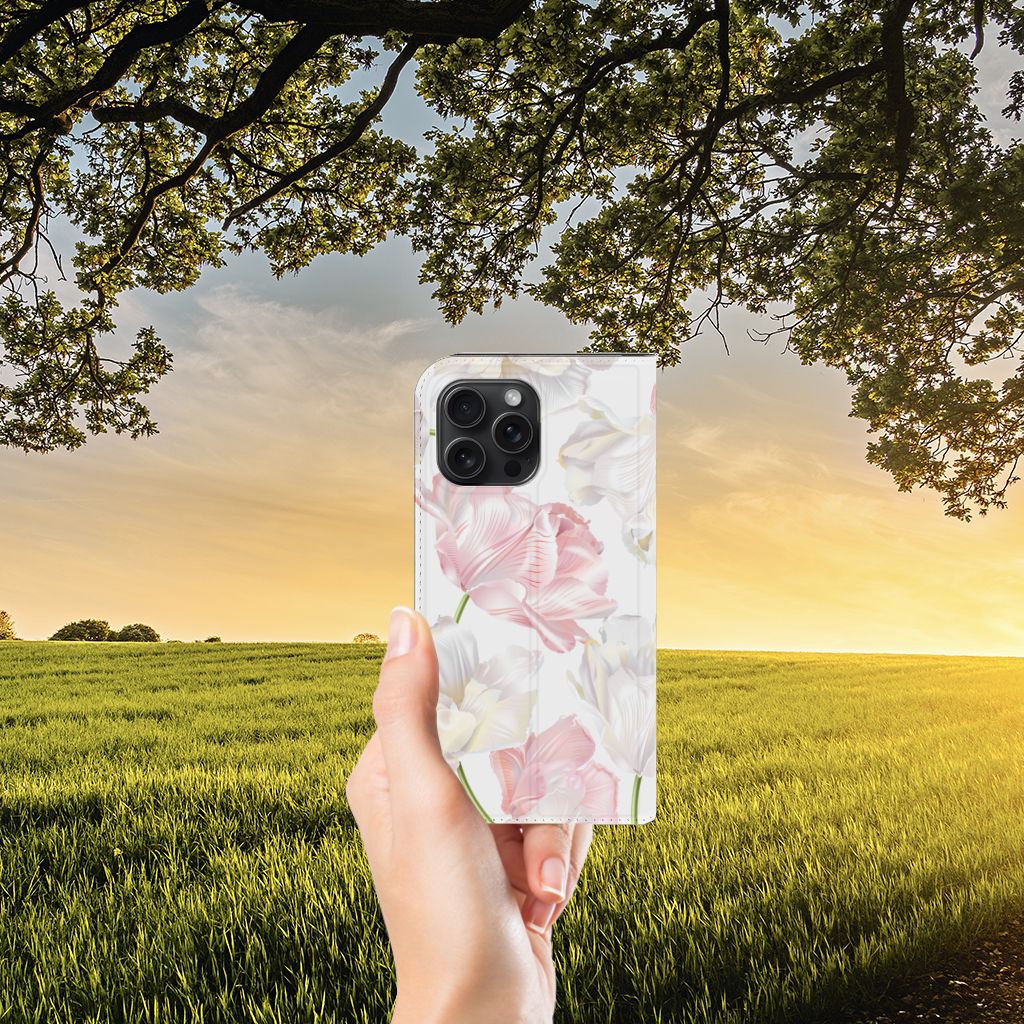 Een bosje bloemen doet een mens (en zijn smartphone) goed. De witte en roze bloemen op dit iPhone 15 Pro Max Smart Cover geven jouw smartphone een zeer mooie uitstraling. Je wordt er ook meteen een stuk rustiger van als je aan het appen of aan het bellen bent. Valt dan je telefoon op de grond, dan zal er dankzij de stand case met het design Lovely Flowers ontstaan. Onze stand cases met roze en witte bloemen zien er zeer prettig uit en zijn heel praktisch, wat blijkt uit onder meer het vakje aan de binnenkant en de handige standaard waarmee je de smartphone rechtop op tafel neer kunt zetten. De roze en witte bloemen passen goed op alle zijden van de case. Op deze stand case van leer en TPU (houder aan de binnenkant) kun je trouwens ook je eigen bloemige ontwerp zetten. In een paar simpele stappen maak je zelf een stand hoesje met daarop jouw mooiste bloemen.