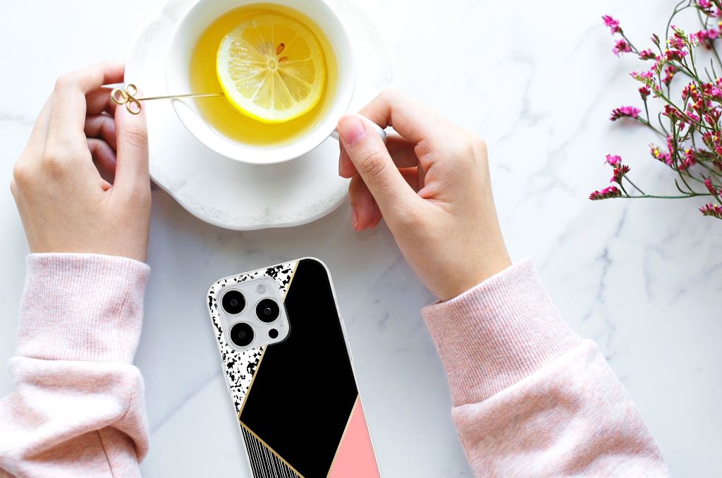 - Met een tpu-siliconen hoesje met roze, zwarte en witte vlakken blijft jouw telefoon in tact.