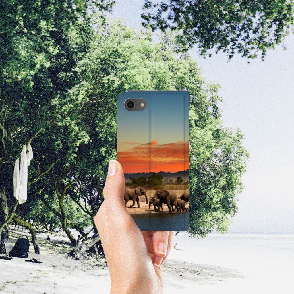 Dit hoesje is zo sterk als een olifant. Dat is goed nieuws, want jouw telefoon heeft een zeer goede bescherming nodig. Dat krijg je met dit design hoesje met print van Olifanten. De Afrikaanse olifant, het allergrootste landdier ter wereld, heeft waarschijnlijk het meest te lijden gehad van stroperij om het ivoor. Deze dieren verdienen dus een goede bescherming, net als jouw smartphone. Met een iPhone 7 | 8 | SE (2020) | SE (2022) Hoesje maken met olifant erop krijg je dit zeker voor elkaar. De stand case beschermt alle zijden van je telefoon en heeft aan de binnenzijde een vakje waarin je een pasje kunt opbergen. De sterke olifant komt zeer goed tot zijn recht op deze case, die aan de binnenkant een houder heeft van tpu. Ook de magneet aan de binnenkant is zeer handig. Alle zijden van de case worden bedrukt met olifanten.