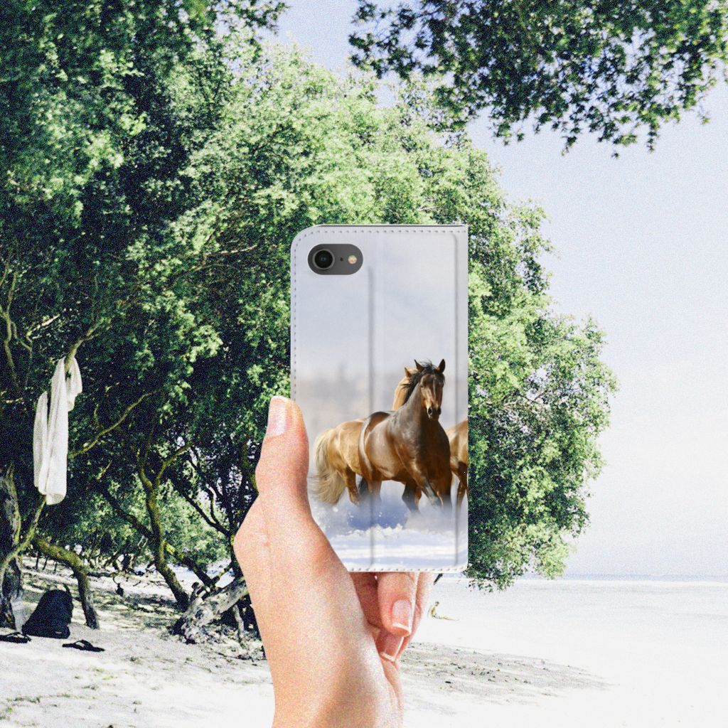 Voor de paardenliefhebbers onder ons hebben we onze collectie uitgebreid met dit design hoesje met print van paarden. Vroeger hield de mens vooral werkpaarden, inmiddels hebben we vriendschap gesloten met het paard. Vandaar dat het ook een favoriet dier is op onze smartphonehoesjes, zoals deze stand cases. Deze iPhone 7 | 8 | SE (2020) | SE (2022) Hoesje maken met Paarden is niet alleen super mooi en chique, het sluit ook nog perfect dankzij de magneet aan de binnenzijde. Verder heeft de case een TPU houder aan de binnenzijde en een houder voor een pasje. Zie je liever je eigen paard terug op een hoesje? Dat kan! Door zelf een uniek hoesje te ontwerpen, met eigen foto’s en teksten. De stand case met paarden wordt aan alle zijden bedrukt.