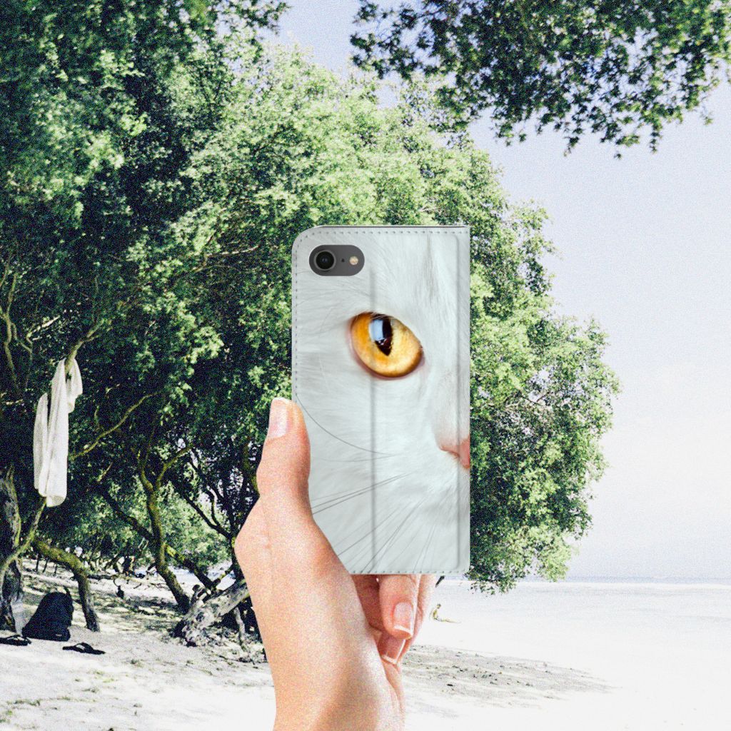Witte katten zijn natuurlijk extra speciaal, vandaar we een exemplaar op een design hoesje hebben gezet. Een witte kat schijnt trouwens ook slechter te kunnen horen dan katten met een andere kleur. Deze witte kat staat op een zeer prominente wijze op een stand case. Deze stand case met witte kat ziet er geweldig uit en is voorzien van verschillende uitsparingen en een speciale standaard. Een iPhone 7 | 8 | SE (2020) | SE (2022) Hoesje maken met witte kat beschermt jouw smartphone perfect. Alle zijden van de case zijn bedrukt. Jouw smartphone wordt erg duurzaam met dit design hoesje. Het TPU aan de binnenzijde is zeer flexibel en het pu-leer oogt chique. Verder heeft de case een houder voor bijvoorbeeld je rijbewijs aan de binnenkant.