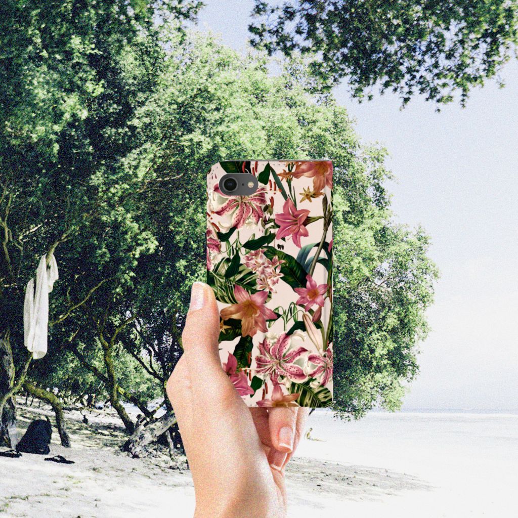 Dit Flowers design is een zegen voor de mens en zijn smartphone. De paarswitte bloemen en groene bladeren op deze iPhone 7 | 8 | SE (2020) | SE (2022) Smart Cover geven jouw smartphone een zeer sierlijke uitstraling. Je krijgt er meteen een goed gevoel bij als je aan het appen, mailen of aan het bellen bent. Valt dan je telefoon op de grond, dan zal er dankzij de stand case met paarswitte bloemen en groene bladeren geen schade ontstaan. Onze stand cases met paarswitte bloemen en groene bladeren bieden de allerbeste bescherming en zijn heel praktisch, wat blijkt uit onder meer het vakje aan de binnenkant en de handige standaard waarmee je de smartphone rechtop op tafel neer kunt zetten. De paarswitte bloemen en groene bladeren komen op alle zijden van de case te staan. Op deze stand case van leer en TPU (houder aan de binnenkant) kun je in no time zelf foto’s van jouw favoriete bloemen zetten.