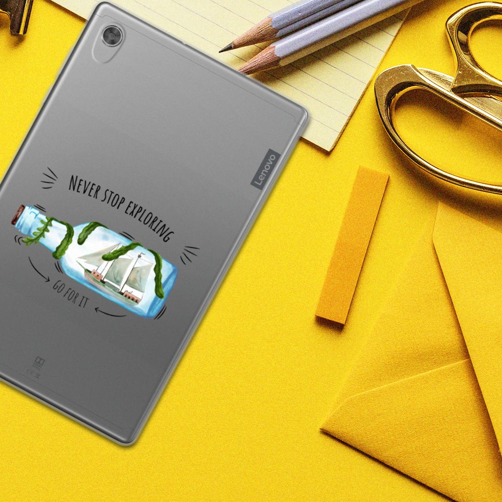 Dit leuke design met een schip in een fles is voor de echte avonturier of reiziger. Dankzij de tekst ‘Never stop exploring: Go for it’ word je altijd herinnerd aan het feit dat het volgende avontuur weer op de loer ligt! Dit design staat op een Tablet Back Cover voor je Lenovo Tab M10 HD (2de generatie). De hoes voor de tablet is gemaakt van TPU, een flexibel maar heel erg sterk plastic dat niet kapot te krijgen is. We adviseren om dit type hoesje te combineren met een screenprotector, zodat je scherm ook goed beschermd is tegen krassen en beschadigingen. De inkt die we gebruiken kan in het begin een sterke geur afgeven. Dit is echter tijdelijk en niet schadelijk voor de gezondheid. Na een kleine week verdwijnt de geur vanzelf.