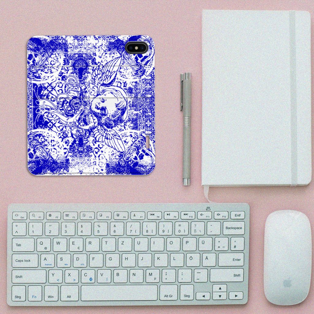 Dit ietwat duistere blauwe patroon tref je vaak aan op een bandana. Een bandana wordt om het hoofd of de hals gedragen. Een bandana is ideaal als je op de racefiets, motor of de brommer zit en jezelf wilt beschermen tegen wind, opwaaiend stof of fijn zand. Leden van motorclubs dragen dit soort bandana’s dan ook graag. Wil je jouw Apple iPhone X | Xs optimaal beschermen tegen opwaaiend stof, zand of andere bedreigingen, dan is dit design hoesje met Angel Skull Blue design een zeer goede keus. Het design staat op een stand case. Deze Mobiel BookCase beschermt jouw telefoon aan alle kanten en beschikt over een 1 opbergvakje en een speciale standaard. Het hoesje wordt afgesloten met een magneet aan de binnenzijde. De houder aan de binnenzijde is van TPU. Alle zijden van de standcase worden bedrukt.