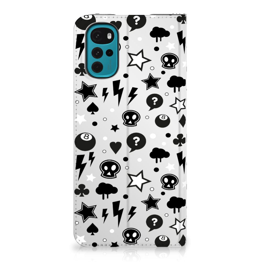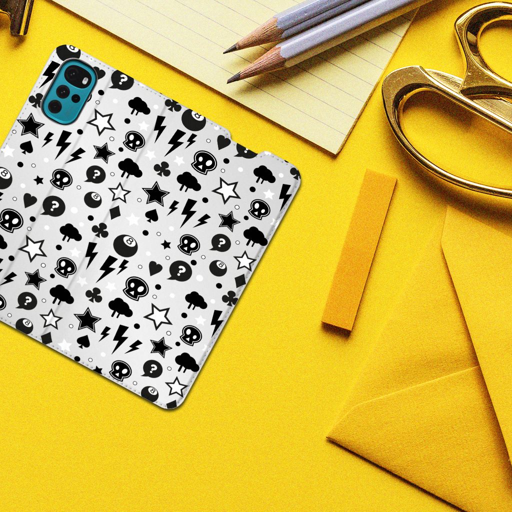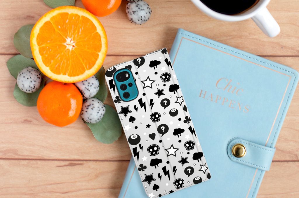 Bliksemflitsen, donderwolken, sterren en biljartballen vliegen op je af als je deze Motorola Moto G22 Mobiel BookCase koopt. Het bijzondere Silver Punk design is van onze eigen ontwerper en vind je in geen enkel andere winkel of webshop. Ben je fan van dit soort stoere en opvallende hoesjes, dan kun je je geluk niet op als je ons assortiment smartphone accessoires bekijkt. Dit zeer populaire smartphone hoesje heeft 1 vakje en is aan alle zijden bedrukt met bliksemflitsen, donderwolken, sterren en biljartballen. Verder heeft de case een standaard en een magneet aan de binnenkant. De houder is van TPU, de buitenzijde van PU-leer. Zelfs doodshoofdjes zie je voorbijkomen in het design. Om maar aan te geven dat je met dit zilveren hoesje een krachtige smartphone accessoire te pakken hebt.