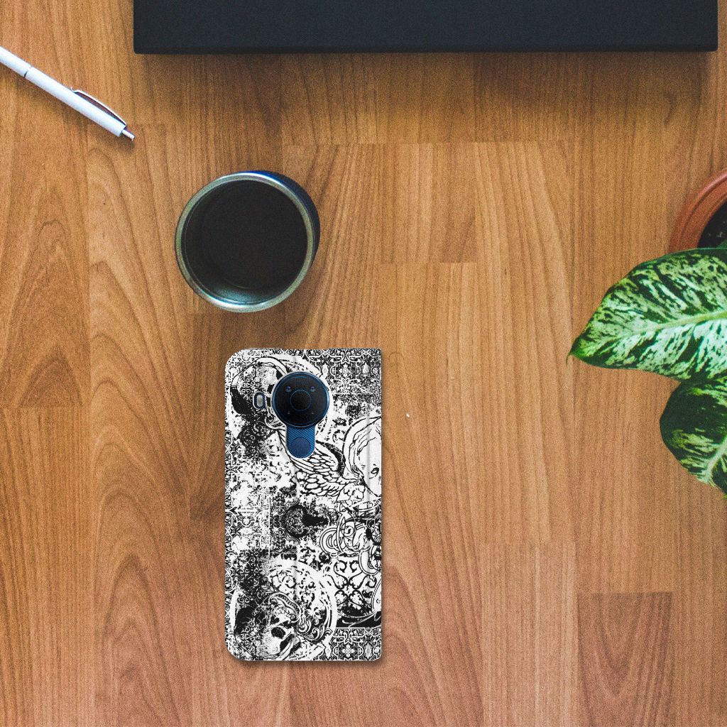 Dit mysterieuze patroon tref je vaak aan op een bandana. Een bandana is een kledingstuk dat om het hoofd of de hals wordt gedragen. Behalve als kledingstuk vindt de bandana soms toepassing als signaal. Een bandana is het eenvoudigste middel als je op de motor of de brommer zit en jezelf wilt beschermen tegen wind, opwaaiend stof of fijn zand. Leden van bekende motorclubs dragen dit kledingstuk dan ook graag, om meerdere redenen. Wil je jouw Nokia 5.4 optimaal beschermen tegen opwaaiend stof, zand of andere bedreigingen, dan is dit design hoesje met Skulls Angel een zeer goede keus. Het design staat op een stand case. Deze case beschermt jouw telefoon aan alle kanten en beschikt over een 1 opbergvakje en een speciale standaard. Het Mobiel BookCase wordt afgesloten met een magneet aan de binnenzijde. De houder aan de binnenzijde is van TPU. Alle zijden van de stand case worden bedrukt.