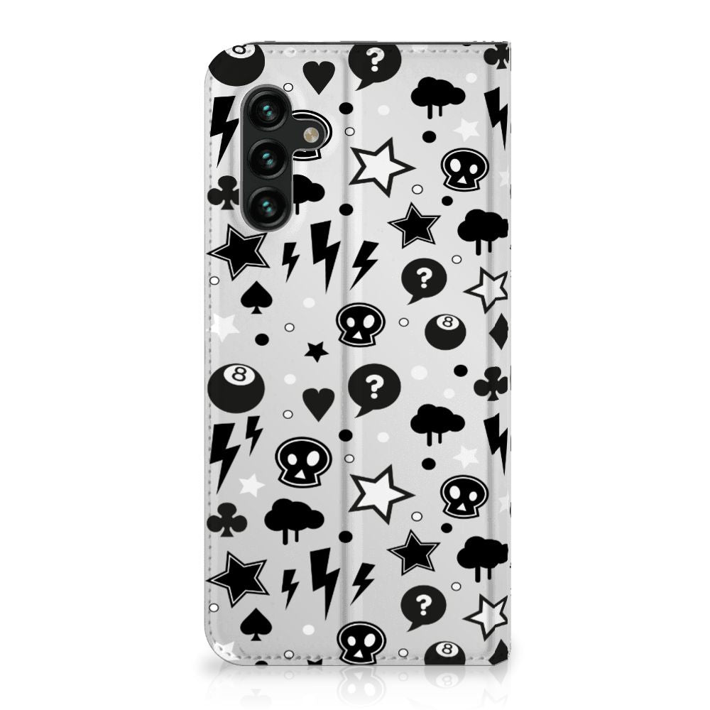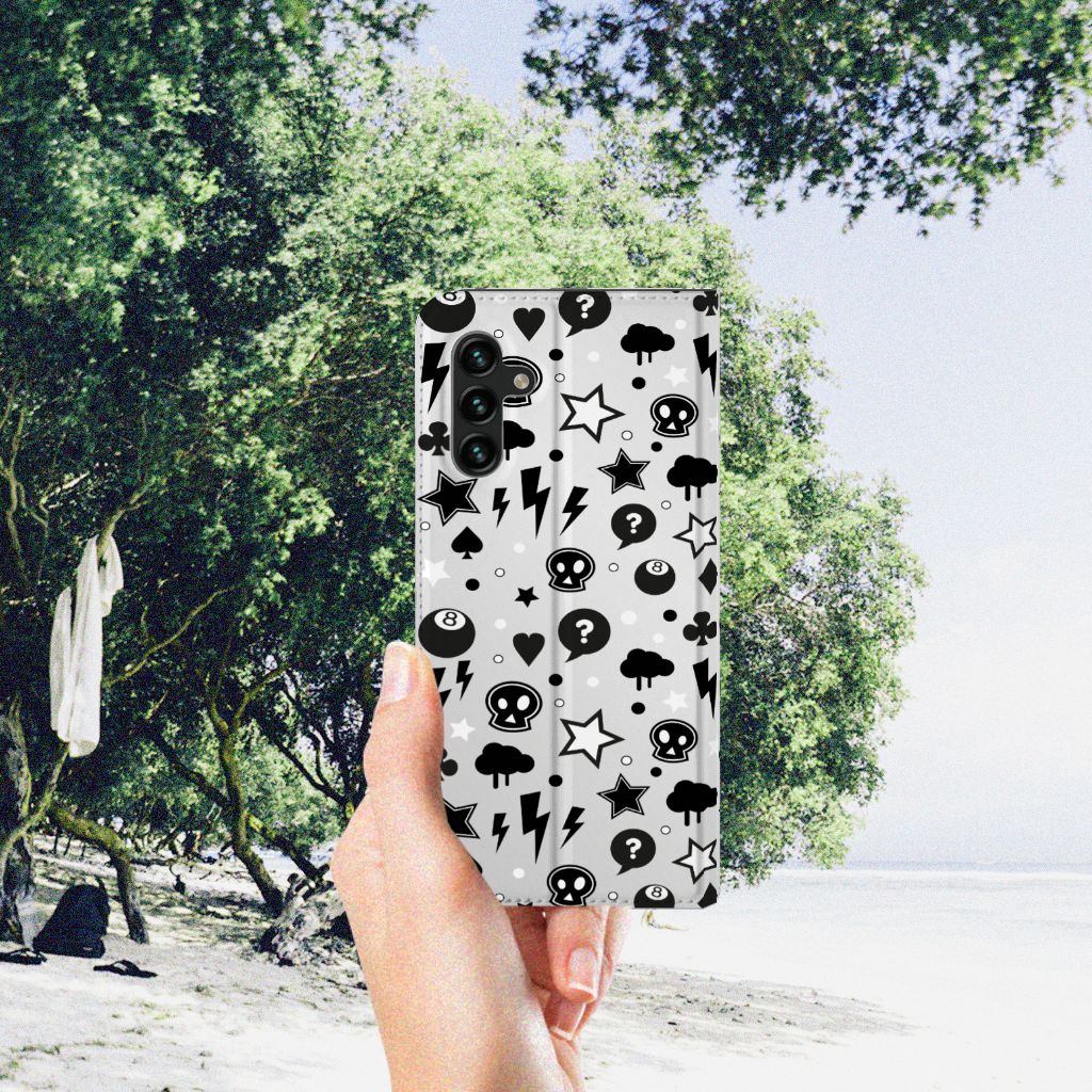 Bliksemflitsen, donderwolken, sterren en biljartballen vliegen op je af als je deze Samsung Galaxy A13 (5G) | Samsung Galaxy A04s Mobiel BookCase koopt. Het bijzondere Silver Punk design is van onze eigen ontwerper en vind je in geen enkel andere winkel of webshop. Ben je fan van dit soort stoere en opvallende hoesjes, dan kun je je geluk niet op als je ons assortiment smartphone accessoires bekijkt. Dit zeer populaire smartphone hoesje heeft 1 vakje en is aan alle zijden bedrukt met bliksemflitsen, donderwolken, sterren en biljartballen. Verder heeft de case een standaard en een magneet aan de binnenkant. De houder is van TPU, de buitenzijde van PU-leer. Zelfs doodshoofdjes zie je voorbijkomen in het design. Om maar aan te geven dat je met dit zilveren hoesje een krachtige smartphone accessoire te pakken hebt.