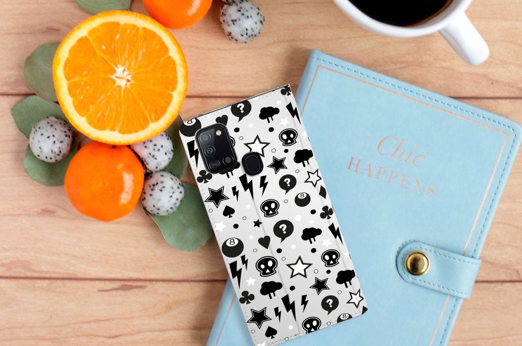 Bliksemflitsen, donderwolken, sterren en biljartballen vliegen op je af als je deze Samsung Galaxy A21s Mobiel BookCase koopt. Het bijzondere Silver Punk design is van onze eigen ontwerper en vind je in geen enkel andere winkel of webshop. Ben je fan van dit soort stoere en opvallende hoesjes, dan kun je je geluk niet op als je ons assortiment smartphone accessoires bekijkt. Dit zeer populaire smartphone hoesje heeft 1 vakje en is aan alle zijden bedrukt met bliksemflitsen, donderwolken, sterren en biljartballen. Verder heeft de case een standaard en een magneet aan de binnenkant. De houder is van TPU, de buitenzijde van PU-leer. Zelfs doodshoofdjes zie je voorbijkomen in het design. Om maar aan te geven dat je met dit zilveren hoesje een krachtige smartphone accessoire te pakken hebt.