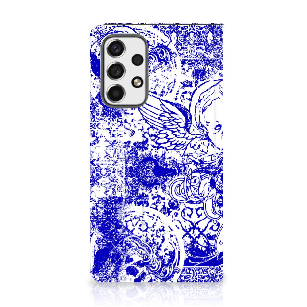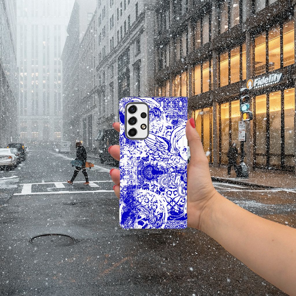 Dit ietwat duistere blauwe patroon tref je vaak aan op een bandana. Een bandana wordt om het hoofd of de hals gedragen. Een bandana is ideaal als je op de racefiets, motor of de brommer zit en jezelf wilt beschermen tegen wind, opwaaiend stof of fijn zand. Leden van motorclubs dragen dit soort bandana’s dan ook graag. Wil je jouw Samsung Galaxy A53 optimaal beschermen tegen opwaaiend stof, zand of andere bedreigingen, dan is dit design hoesje met Angel Skull Blue design een zeer goede keus. Het design staat op een stand case. Deze Mobiel BookCase beschermt jouw telefoon aan alle kanten en beschikt over een 1 opbergvakje en een speciale standaard. Het hoesje wordt afgesloten met een magneet aan de binnenzijde. De houder aan de binnenzijde is van TPU. Alle zijden van de standcase worden bedrukt.