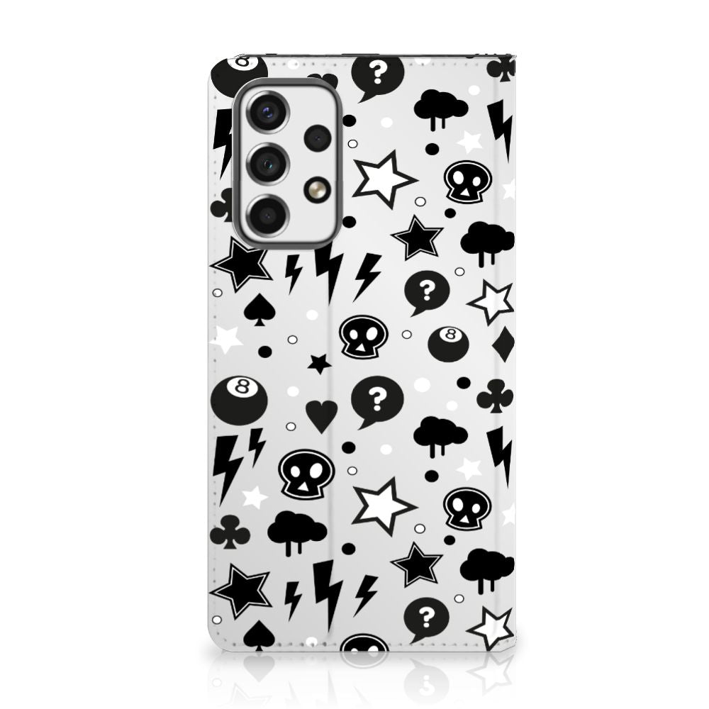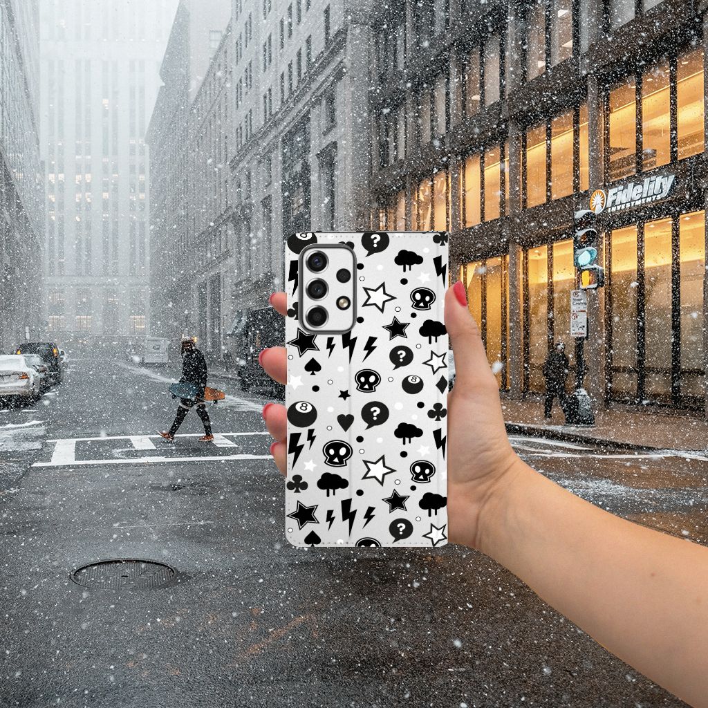Bliksemflitsen, donderwolken, sterren en biljartballen vliegen op je af als je deze Samsung Galaxy A53 Mobiel BookCase koopt. Het bijzondere Silver Punk design is van onze eigen ontwerper en vind je in geen enkel andere winkel of webshop. Ben je fan van dit soort stoere en opvallende hoesjes, dan kun je je geluk niet op als je ons assortiment smartphone accessoires bekijkt. Dit zeer populaire smartphone hoesje heeft 1 vakje en is aan alle zijden bedrukt met bliksemflitsen, donderwolken, sterren en biljartballen. Verder heeft de case een standaard en een magneet aan de binnenkant. De houder is van TPU, de buitenzijde van PU-leer. Zelfs doodshoofdjes zie je voorbijkomen in het design. Om maar aan te geven dat je met dit zilveren hoesje een krachtige smartphone accessoire te pakken hebt.