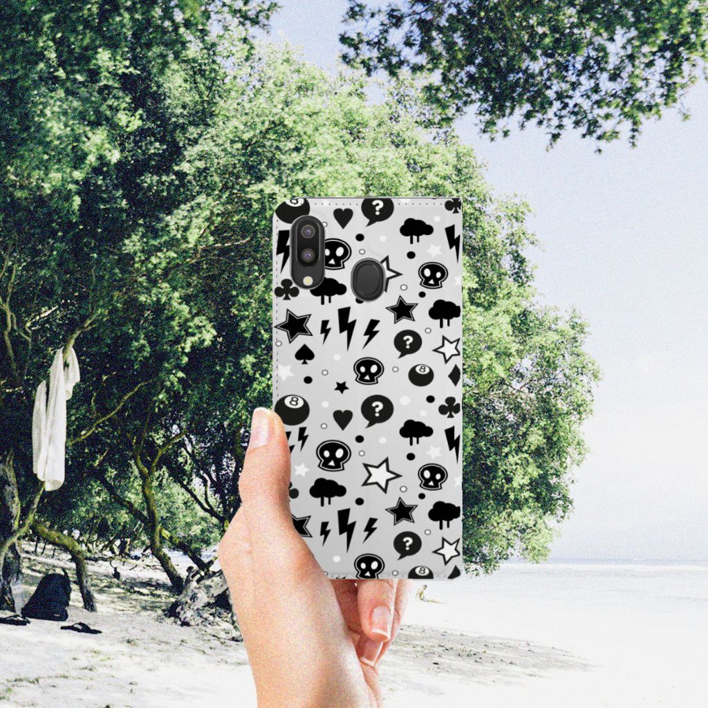 Bliksemflitsen, donderwolken, sterren en biljartballen vliegen op je af als je deze Samsung Galaxy M20 Mobiel BookCase koopt. Het bijzondere Silver Punk design is van onze eigen ontwerper en vind je in geen enkel andere winkel of webshop. Ben je fan van dit soort stoere en opvallende hoesjes, dan kun je je geluk niet op als je ons assortiment smartphone accessoires bekijkt. Dit zeer populaire smartphone hoesje heeft 1 vakje en is aan alle zijden bedrukt met bliksemflitsen, donderwolken, sterren en biljartballen. Verder heeft de case een standaard en een magneet aan de binnenkant. De houder is van TPU, de buitenzijde van PU-leer. Zelfs doodshoofdjes zie je voorbijkomen in het design. Om maar aan te geven dat je met dit zilveren hoesje een krachtige smartphone accessoire te pakken hebt.