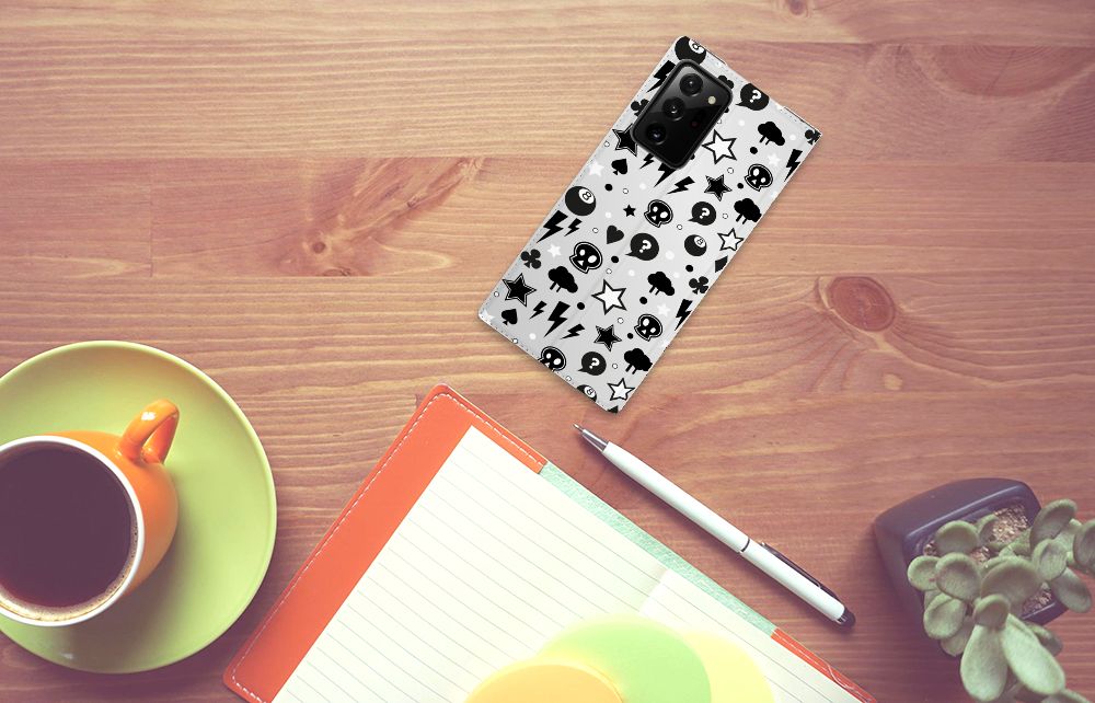 Bliksemflitsen, donderwolken, sterren en biljartballen vliegen op je af als je deze Samsung Galaxy Note 20 Ultra Mobiel BookCase koopt. Het bijzondere Silver Punk design is van onze eigen ontwerper en vind je in geen enkel andere winkel of webshop. Ben je fan van dit soort stoere en opvallende hoesjes, dan kun je je geluk niet op als je ons assortiment smartphone accessoires bekijkt. Dit zeer populaire smartphone hoesje heeft 1 vakje en is aan alle zijden bedrukt met bliksemflitsen, donderwolken, sterren en biljartballen. Verder heeft de case een standaard en een magneet aan de binnenkant. De houder is van TPU, de buitenzijde van PU-leer. Zelfs doodshoofdjes zie je voorbijkomen in het design. Om maar aan te geven dat je met dit zilveren hoesje een krachtige smartphone accessoire te pakken hebt.