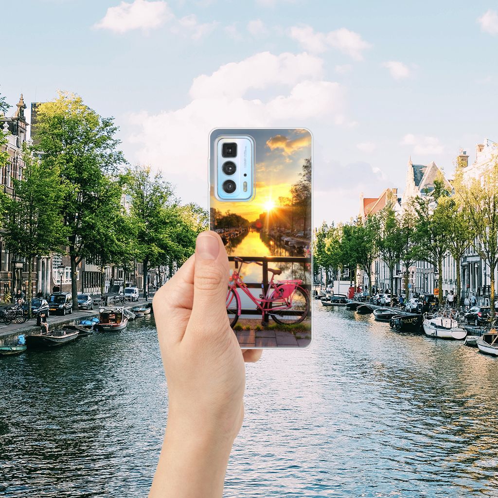 Amsterdam is meer dan ooit een toeristische trekpleister. Een bezoek aan de hoofdstad is niet compleet als je niet aanlegt bij de Amsterdamse Grachten. Ze zijn een symbool van de stad en hebben een enorme culturele en historische waarde. Daarom kunnen ze natuurlijk niet ontbreken in onze collectie design hoesjes. Dit schitterende design hoesje met Amsterdamse grachten tref je enkel en alleen aan bij B2C Telecom. De ondergaande zon en de fleurige en fraaie bloempakketten zorgen voor een prachtig totaalplaatje. Amsterdam is wereldberoemd om haar prachtige grachten uit de zeventiende eeuw. Dit smartphone hoesje is hier een eerbetoon aan. Het design staat op een TPU case. Dit Motorola Edge 20 Pro Siliconen Back Cover wordt alleen aan de bovenkant bedrukt en is zeer flexibel. De randen van het hoesje blijven transparant.
