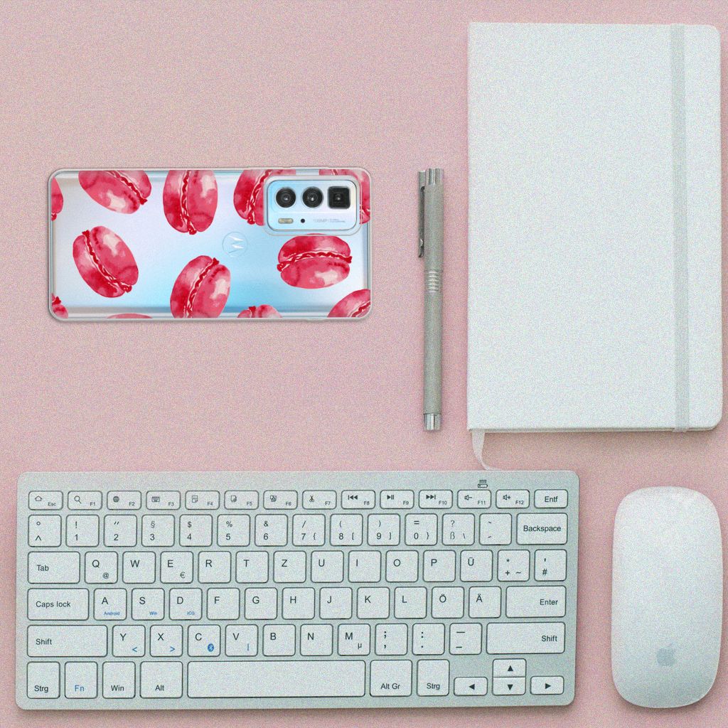 Dit tpu hoesje met Pink Macarons is een zeer opvallende bescherming voor jouw smartphone. Macarons zijn Franse koekjes: kleine, rond en luchtig. Ze worden in veel verschillende smaken gemaakt, herkenbaar aan de verschillende kleuren zoals chocolade (donkerbruin), mokka (middenbruin), kersen (rood), pistache (groen), aardbei (roze), framboos (karmijn). Deze kleuren kun je niet allemaal zien op dit fraaie design hoesje met roze macarons. Heb je altijd al een Motorola Edge 20 Pro Siliconen Case willen hebben met roze macarons? Grijp dan nu je kans. Deze case heeft zeer veel goede eigenschappen, zoals elastisch vermogen, flexibiliteit en schokbestendigheid. Dit design hoesje met roze macarons wordt aan de bovenkant bedrukt, de zijkanten blijven doorzichtig. De case heeft opstaande randen aan de voorzijde en beschermt samen met een screenprotector jouw telefoon perfect. De case heeft ook een handige standaard.