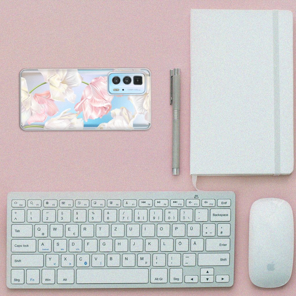 Een bosje bloemen doet een mens (en zijn smartphone) goed. De witte en roze bloemen op deze Motorola Edge 20 Pro TPU Case geven jouw smartphone een zeer mooie uitstraling. Je wordt er ook meteen een stuk rustiger van als je aan het appen of aan het bellen bent. Valt dan je telefoon op de grond, dan zal er dankzij de tpu case met het design Lovely Flowers ontstaan. Helemaal niet als je er een screenprotector bij hebt gekocht. Onze tpu cases met roze en witte bloemen zien er zeer prettig uit en zijn heel praktisch, getuige onder meer de opstaande randen en het flexibele materiaal. Alleen de achterkant van de tpu case wordt bedrukt met roze en witte bloemen. Op deze tpu case kun je trouwens ook een eigen ontwerp zetten. In een paar simpele stappen ontwerp je zelf een stand case met daarop jouw favoriete bloemen.