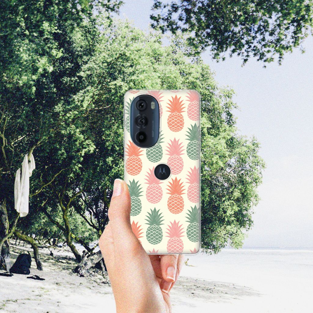 Ananas is een woord uit het Tupi, de taal van de Tupi-indianen, en betekent uitmuntende vrucht. Dit fruit van zeer hoge kwaliteit staat op onze superieure boekhoesjes, stand cases, hard cases en TPU cases. Jij blijft er gezond uitzien als je zo nu en dan een hap neemt van een Ananas , jouw smartphone blijft tip top in orde als je er een leuk telefoonhoesje omheen doet. Een ananas heeft stevig, veerkrachtig vruchtvlees. Een beetje te vergelijken met het TPU in onze hoesjes. TPU is elastisch materiaal, dat zeer buigzaam is. Vandaar dat het zeer schokbestendig is. Het ananas design staat op een staat op een TPU case. Deze Motorola Edge 30 Pro Siliconen Case wordt alleen aan de bovenkant bedrukt en is zeer flexibel. De randen van het hoesje blijven transparant.