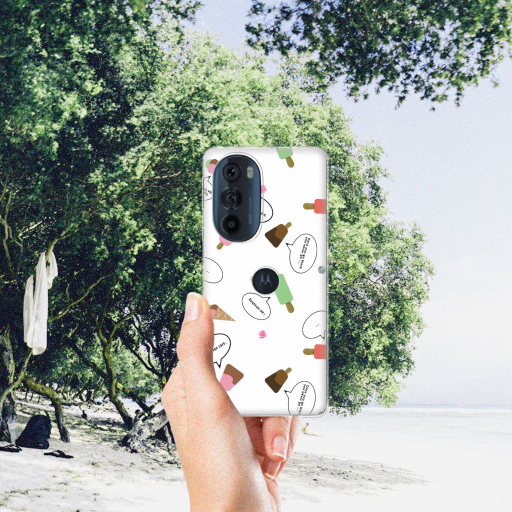 Van deze vrolijke Motorola Edge 30 Pro Siliconen Case met daarop verschillende soorten ijsjes met tekstwolkjes krijg je sowieso een vrij en zomers gevoel. De zomer komt naar je toe met deze print van ijsjes met tekstwolkjes. Ben je op het strand, dan ontbreekt een lekker ijsje natuurlijk niet. Net zoals je je smartphone bij de hand hebt, met daaromheen een design hoesje met bijzondere ijsjes en tekstwolkjes. Jouw telefoon kan dan de bescherming in de vorm van een tpu hoesje met ijsjes zeer goed gebruiken. De bovenkant van dit hoesje wordt bedrukt met ijsjes en tekstwolkjes, de zijkanten blijven doorzichtig. De case is gemaakt van schokabsorberend materiaal en past altijd in je broekzak. Onder alle weersomstandigheden zal deze TPU case perfect functioneren, ook in de zomer met een ijsje in je hand.