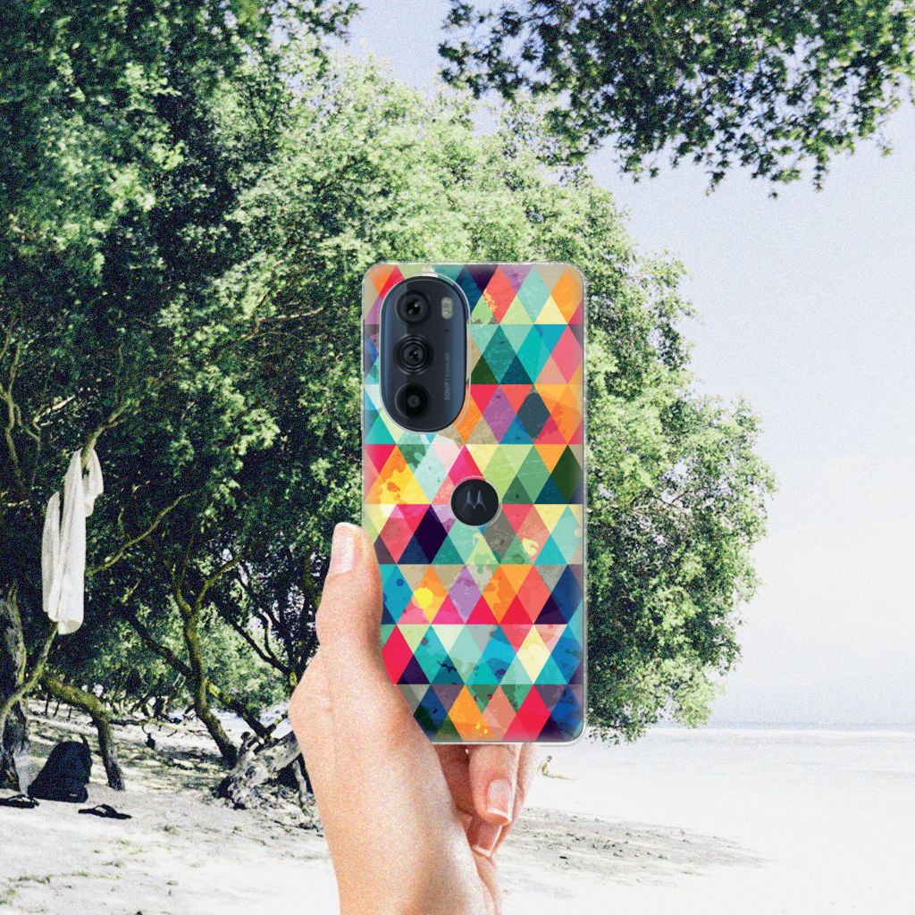 Van dit geruite design hoesje moet je een beetje houden. Maar als je het eenmaal in bezit hebt, ben je waarschijnlijk binnen no time verkocht. Het design heeft ruitjes in alle kleuren van de regenboog en door de grijze achtergrond kan het hoesje enigszins druk overkomen. Maar tegelijkertijd is dit de kracht van het hoesje. Met dit design hoesje Geruit zal je namelijk heel erg opvallen. Dit is voor veel vooral jonge smartphone gebruikers een belangrijk voordeel. Deze geruite print staat op een Motorola Edge 30 Pro TPU bumper. Dit zeer flexibele smartphone hoesje heeft alle nodige uitsparingen en past altijd in je broekzak. De case is aan de bovenkant bedrukt, de randen blijven transparant.