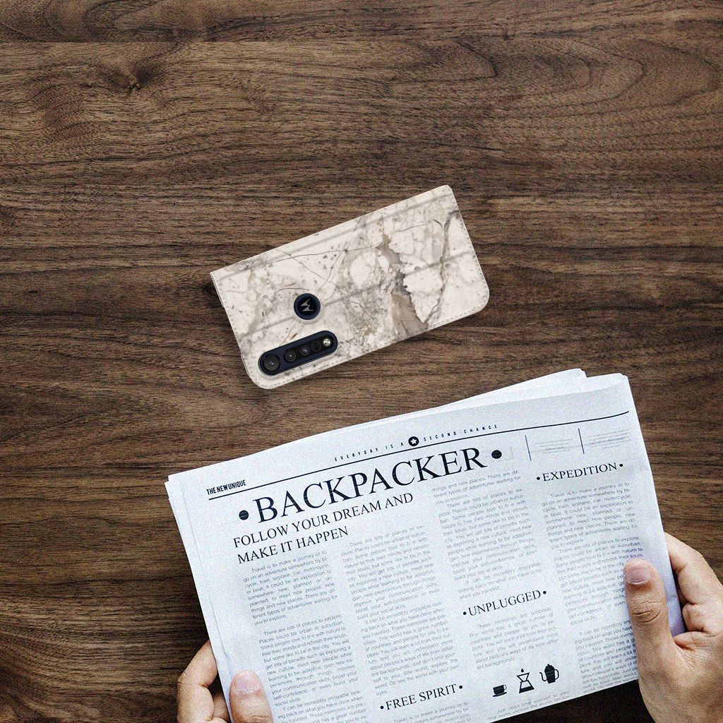 Dit design hoesje met Marmer Beige is voor de artistieke personen onder ons. De Grieken en Romeinen wisten het steen al te waarderen door het als bouw- en bekledingsmateriaal toe te passen. Naast het witte Carrara marmer met haar zacht grijze geaderde belijning zijn de diverse marmersoorten in een ruim kleurenpallet te krijgen. We hebben verschillende kleuren op design hoesjes gezet, zoals in dit geval beige marmer. Dit is een Motorola G8 Plus Standcase met marmer in beige kleur. Het marmer wordt bedrukt op alle zijden van een stand case, die beschikt over 1 vakje voor een pasje en toebehoren en een magnetische sluiting aan de binnenkant. Verder heeft de case een houder van TPU. De rijkheid aan kleuren en varianties in afwerking geeft designers de vrijheid om met marmer hele mooie architectonische projecten te realiseren. Wij hebben onze designer ook veel vrijheid gegeven. Het resultaat zie je terug in deze stand case met beige marmer, dat de ideale bescherming voor jouw smartphone biedt.