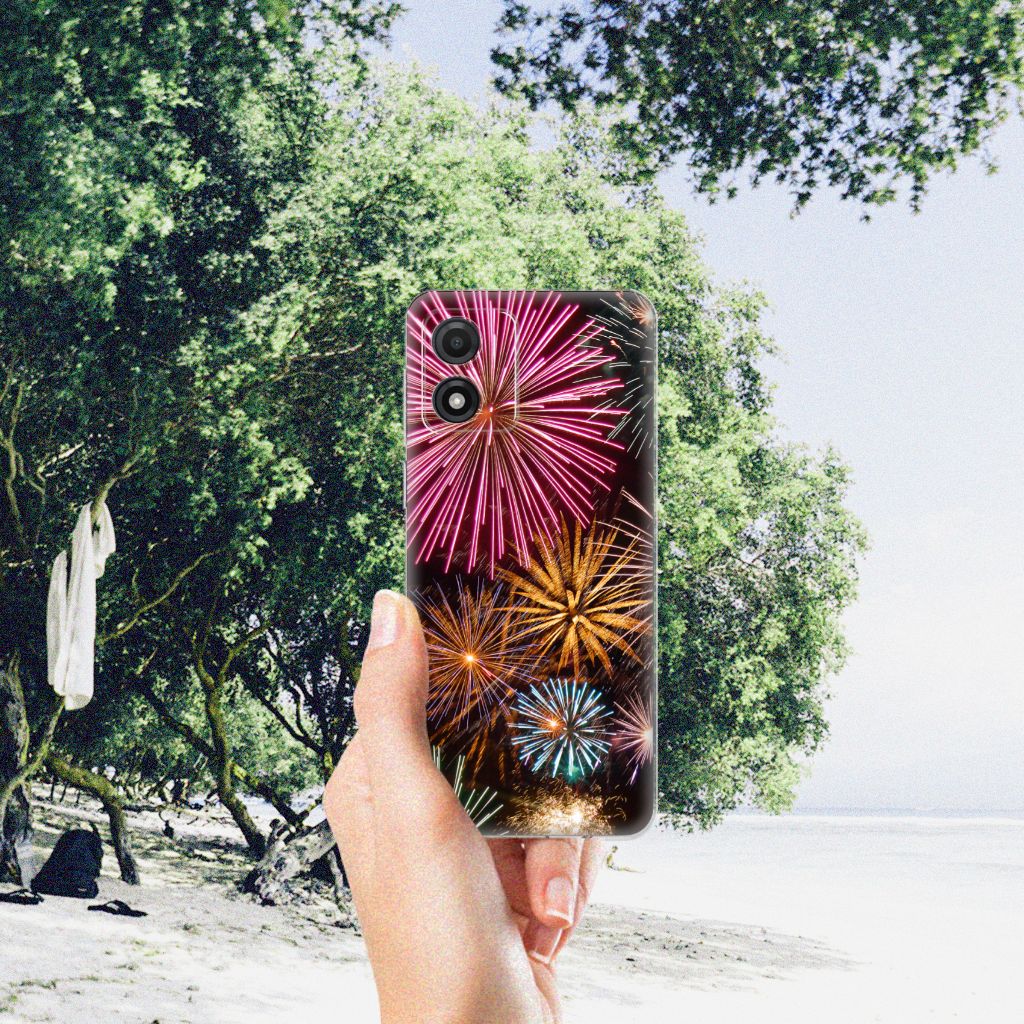 Deze Motorola Moto E13 Silicone Back Cover levert gegarandeerd Vuurwerk op. Kijk alleen al eens naar de print van siervuurwerk, in zeer veel verschillende kleuren. Als je dit hoesje ziet kun je bijna niet geloven dat sommige gemeenten in Nederland overwegen om vuurwerk te verbieden. Er gebeuren weliswaar ongelukken mee, maar zoiets schitterends als op deze tpu case met vuurwerk wil je toch gewoon niet missen. Bovendien beschermt dit hoesje jouw smartphone ook nog eens erg goed. De bovenkant van dit hoesje wordt bedrukt, de zijkanten blijven doorzichtig. De case is gemaakt van schokabsorberend materiaal en past altijd in je broekzak. Onder alle omstandigheden zal deze TPU case perfect functioneren, ook als je met nieuwjaar vuurwerk aan het afsteken bent. Zorg dan overigens wel dat je zelf ook voldoende afgeschermd bent van het vuurwerk.