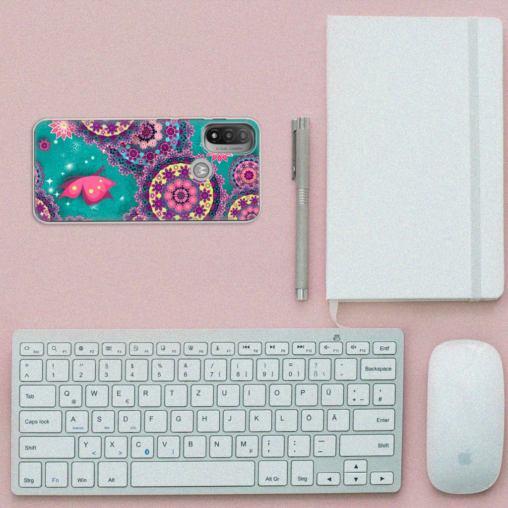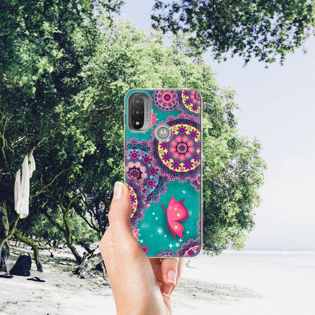 Deze opvallende Motorola Moto E20 | E40 Hoesje maken met Cirkels en Vlinders is een ware eyecatcher. De meeste vlinders hebben een onopvallende vleugelkleur en dat kun je van de soort op dit hoesje ook zeker wel zeggen. Wij kunnen deze opvallende vlinders en cirkels op een zeer handige tpu case zetten. Deze hoesjes zijn gewild omwille hun flexibiliteit. Met onze geavanceerde printer zetten we de print van opvallende vlinders en cirkels op de achterkant van het hoesje. De case met vlinders en cirkels blijft aan de zijkanten doorzichtig, zodat je maximaal het design van je smartphone behoudt. Verder is je telefoon natuurlijk goed beschermd met deze tpu case met print van blauwe vlinders. De bovenkant wordt bedrukt, de zijkanten niet. Met een screenprotector bescherm je ook het scherm maximaal.
