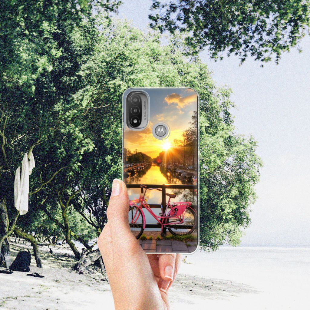 Amsterdam is meer dan ooit een toeristische trekpleister. Een bezoek aan de hoofdstad is niet compleet als je niet aanlegt bij de Amsterdamse Grachten. Ze zijn een symbool van de stad en hebben een enorme culturele en historische waarde. Daarom kunnen ze natuurlijk niet ontbreken in onze collectie design hoesjes. Dit schitterende design hoesje met Amsterdamse grachten tref je enkel en alleen aan bij B2C Telecom. De ondergaande zon en de fleurige en fraaie bloempakketten zorgen voor een prachtig totaalplaatje. Amsterdam is wereldberoemd om haar prachtige grachten uit de zeventiende eeuw. Dit smartphone hoesje is hier een eerbetoon aan. Het design staat op een TPU case. Dit Motorola Moto E20 | E40 Siliconen Back Cover wordt alleen aan de bovenkant bedrukt en is zeer flexibel. De randen van het hoesje blijven transparant.