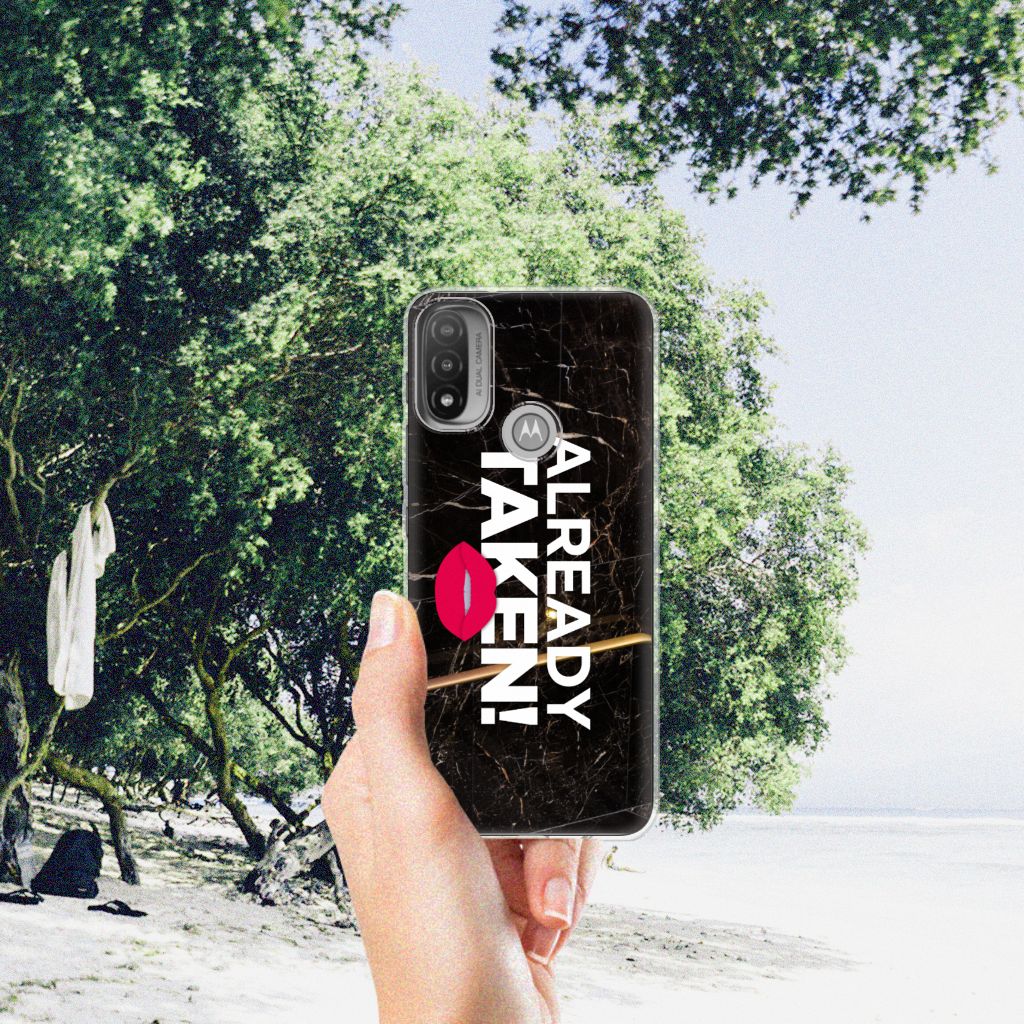 Met deze Motorola Moto E20 | E40 Siliconen hoesje met naam met Already Taken Black tekst maak je duidelijk dat jouw smartphone een kostbaar bezit is, waar je zeer lang over wilt beschikken. Je telefoon neem je waarschijnlijk vaak ter hand, dus dan zal de boodschap als je over dit hoesje beschikt zeker weten overkomen. De TPU case wordt alleen aan de bovenkant bedrukt en is zeer flexibel. De randen van het hoesje blijven transparant. Wil je een eigen tekst op je hoesje zetten? Dit kan ook, met onze Phone Case Designer. Deze unieke ontwerpmodule is ook geschikt om het design uit te breiden met foto’s, effecten en patronen.