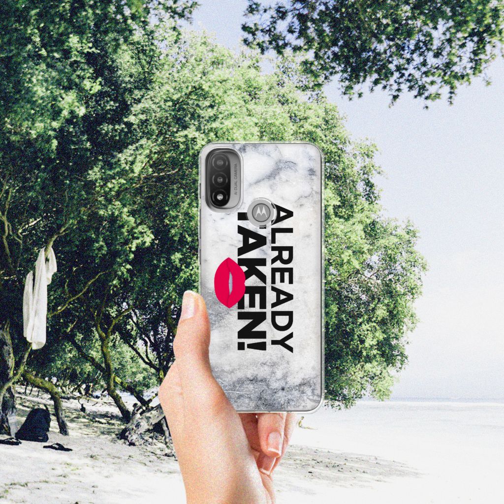 Stel dat je opdringende vrouwen of mannen van je af wil schudden op het moment dat je aan het feesten bent, omdat je al een partner hebt. Dan kun je dat met dit hoesje uitstekend duidelijk maken. Je Motorola Moto E20 | E40 neem je waarschijnlijk vaak ter hand, dus dan zal de boodschap als je over dit hoesje beschikt zeker weten overkomen. Ook in het openbaar vervoer zal dit hoesje ervoor zorgen dat je minder snel versierd wordt door het andere geslacht. Als je vrijgezel bent en op zoek naar gezelschap, dan kun je beter kiezen voor een ander hoesje uit ons ruime en gevarieerde assortiment. Het design Already Taken White staat op een Siliconen hoesje met naam. Dit hoesje wordt alleen aan de bovenkant bedrukt en is zeer flexibel. De randen van het hoesje blijven transparant.