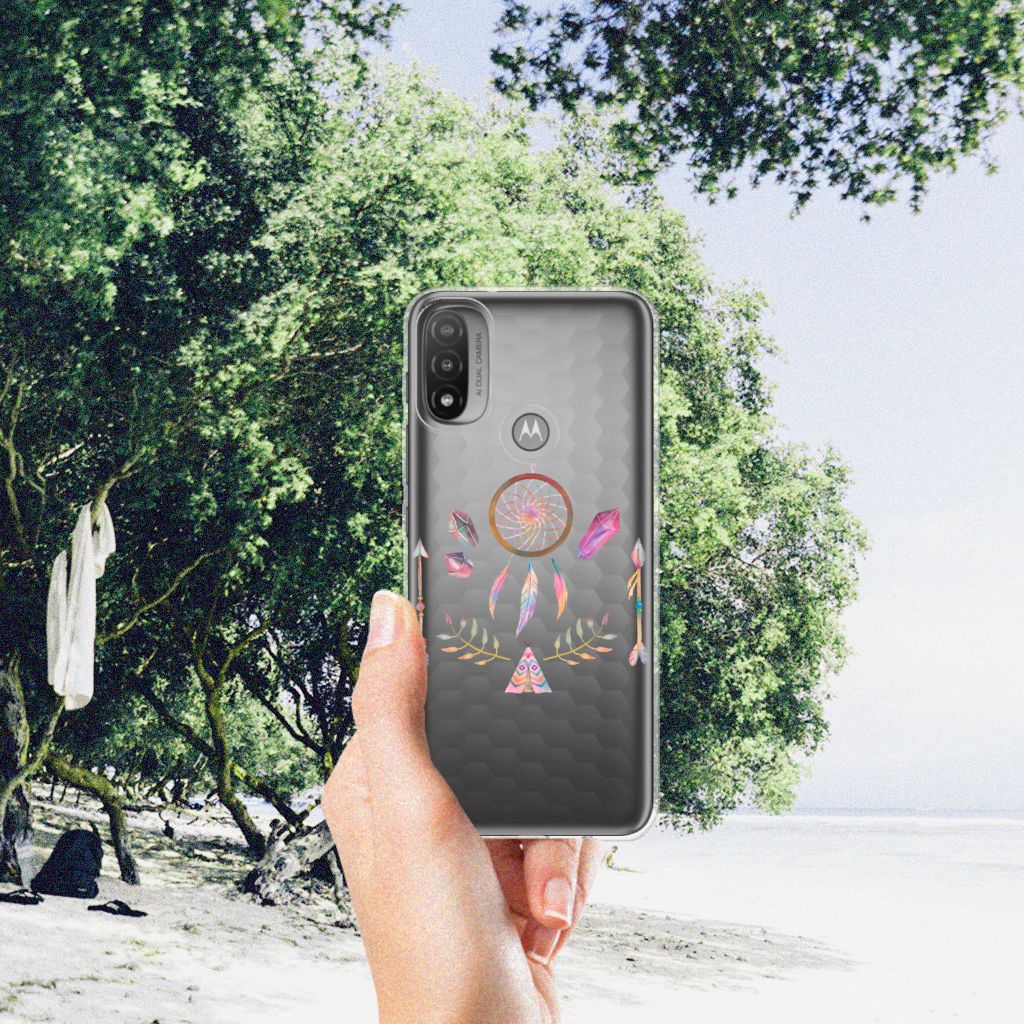Een dromenvanger werd lang geleden al door een indianenvolk in Noord-Amerika gebruikt om nare dromen te weren. Nu nog hangen mensen over de hele wereld dromenvangers boven hun bed. Maar ook op een telefoonhoesje staat zo’n boho dreamcatcher heel mooi. Dit mooie design dat bestaat uit een tipi, pijlen en dromenvanger heeft veel verschillende prachtige kleuren. Maar omdat het ontwerp minimalistisch en klein is, is het design toch subtiel te noemen. Dit ontwerp staat op een Telefoonhoesje met Naam voor je Motorola Moto E20 | E40. TPU is flexibel en heel erg sterk. Zo is je telefoon aan de achterkant en de randen heel goed beschermd. De case is aan de bovenkant bedrukt, de randen blijven transparant. Het TPU-hoesje is perfect te combineren met een screenprotector, zo zijn je telefoon en je beeldscherm altijd goed beschermd.